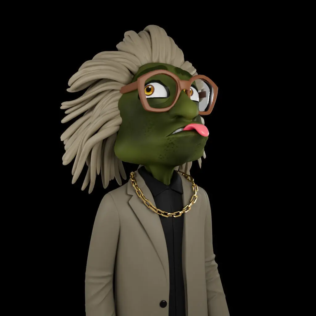 A crazy Scientist with a green skin tone, wearing a light brown blazer over a black shirt, accessorized with a gold chain necklace. The character has long, wavy white hair and is making an expressive face with its tongue sticking out.