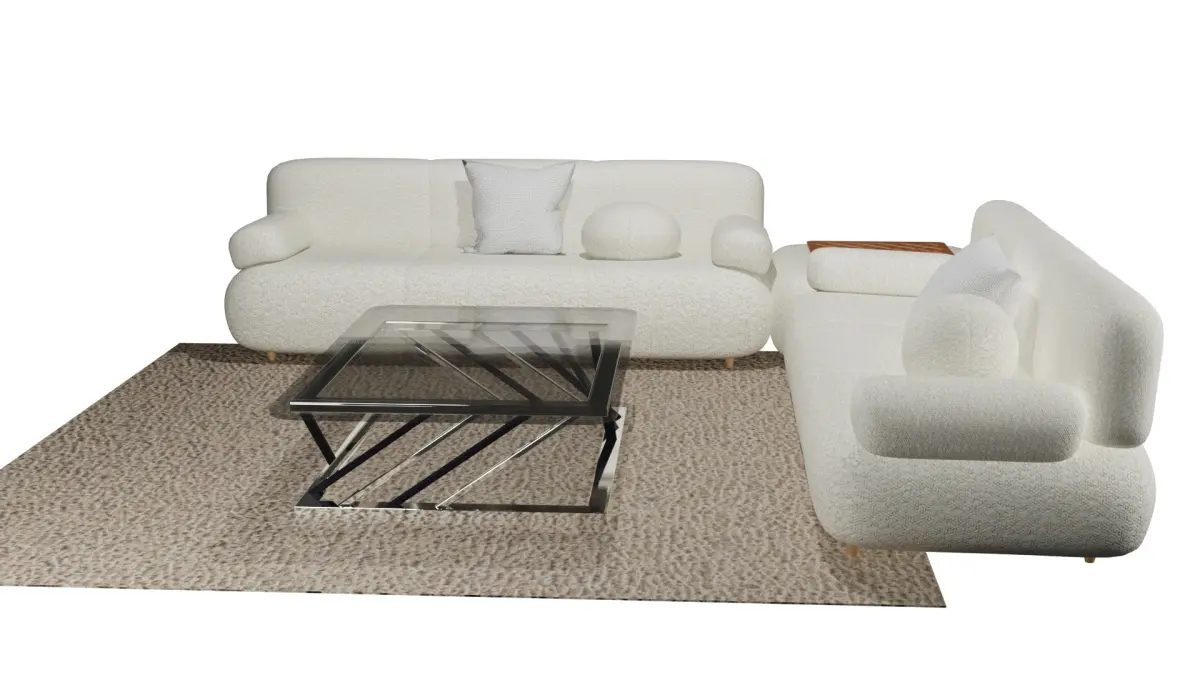 The cream boucle 6-seater sofa exudes cozy, elegance with its texture, soft fabric.Paired with a metal base center table topped with translucent fine glass,it creates a sophisticated and modern look. The combination of the plush and the sleek,minimalist table offers both comfort and style, making it perfect addition to any comtemporary living space.