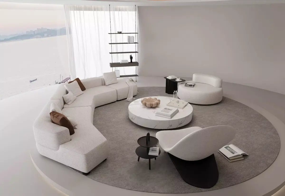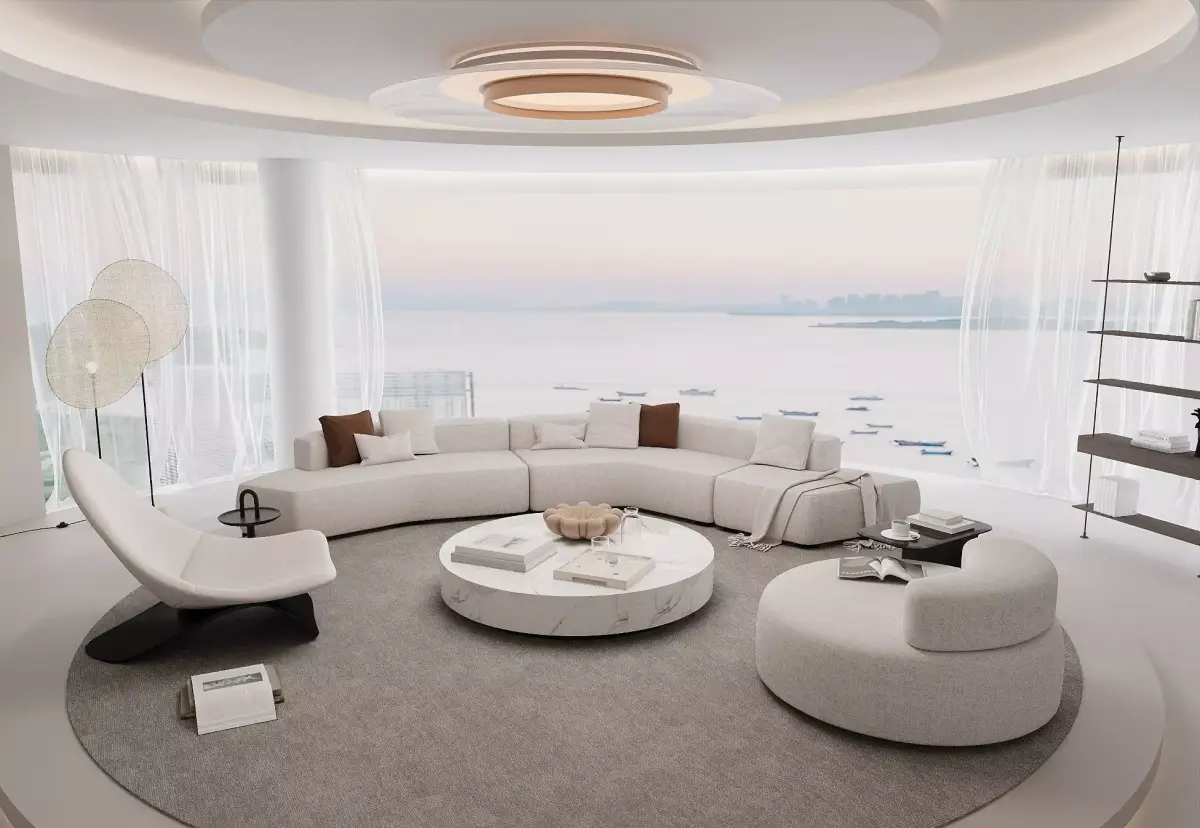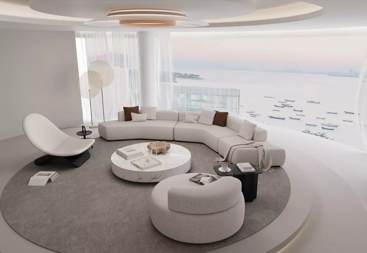 Experience a Creamy Minimalist Living Room inspired by the calm tones of modern seaside apartments.The design features panoramic ocean views, curved architecture, and a harmonious neutral palette that defines contemporary luxury.