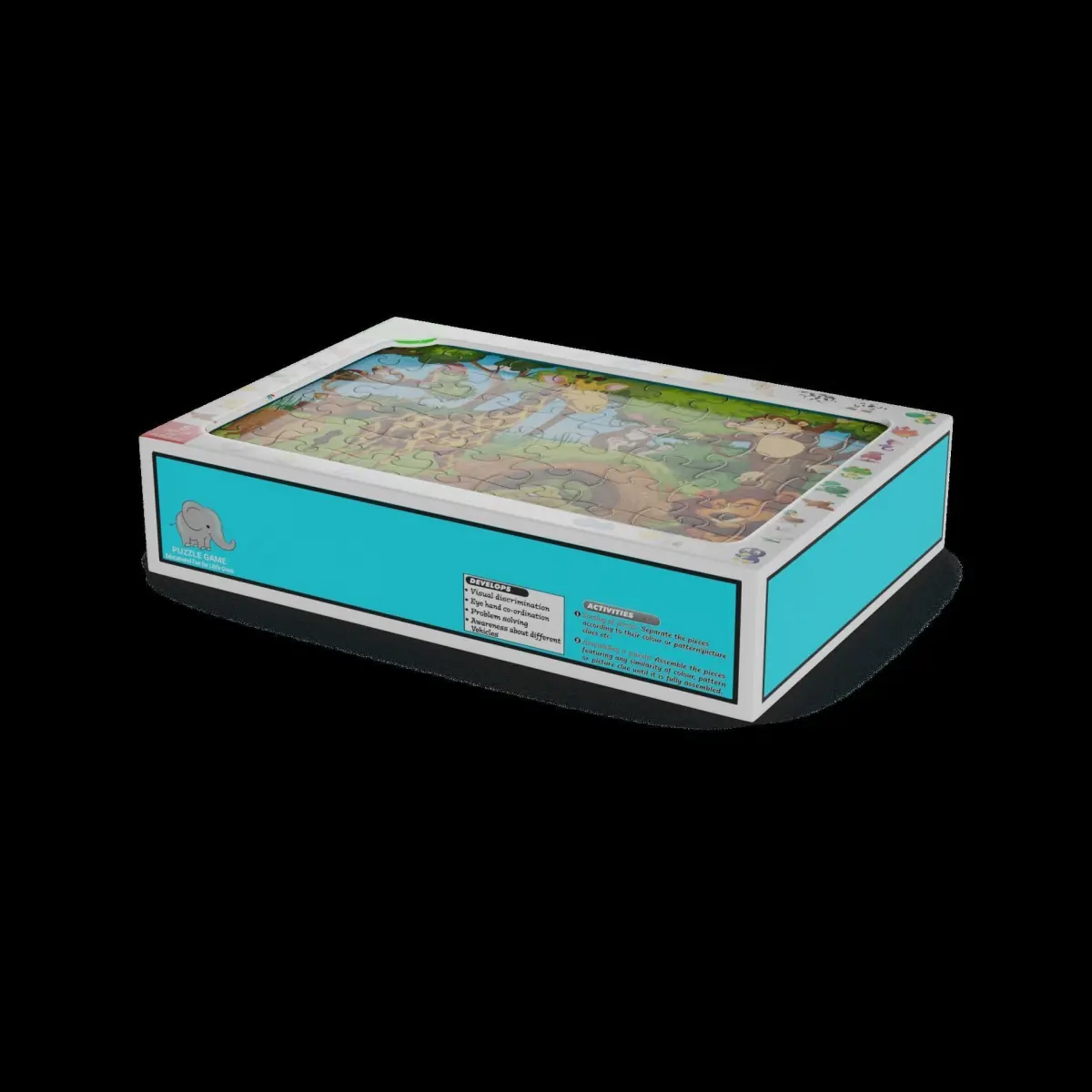 Playful Puzzles: A set of colorful, interactive puzzles designed to stimulate your child's problem-solving skills. Each puzzle piece is made of sturdy cardboard, featuring vibrant illustrations of animals, numbers, and shapes. The packaging is a compact, rectangular box with a clear plastic window, allowing you to see the puzzle pieces inside. The box is adorned with a playful graphic of a smiling child, and includes a label that says Educational Fun for Little Ones.