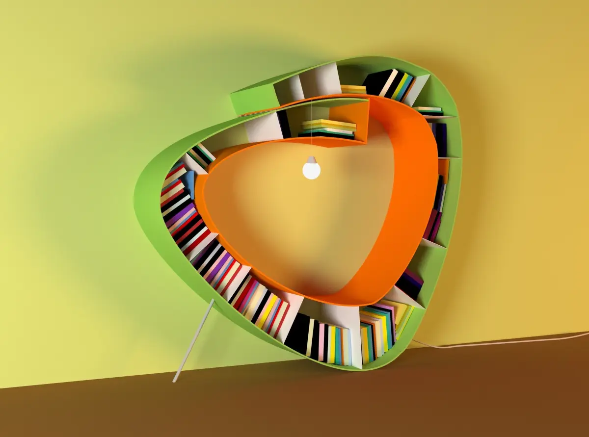 creative bookcase with lamp. the space in the middle is for sitting part. A lamp was placed so that it would not be dark while sitting and reading a book. You can use this wardrobe in library projects or interior projects of houses, offices, cafes, stores.