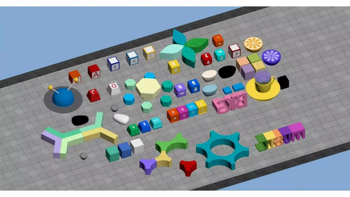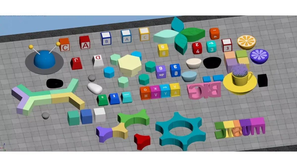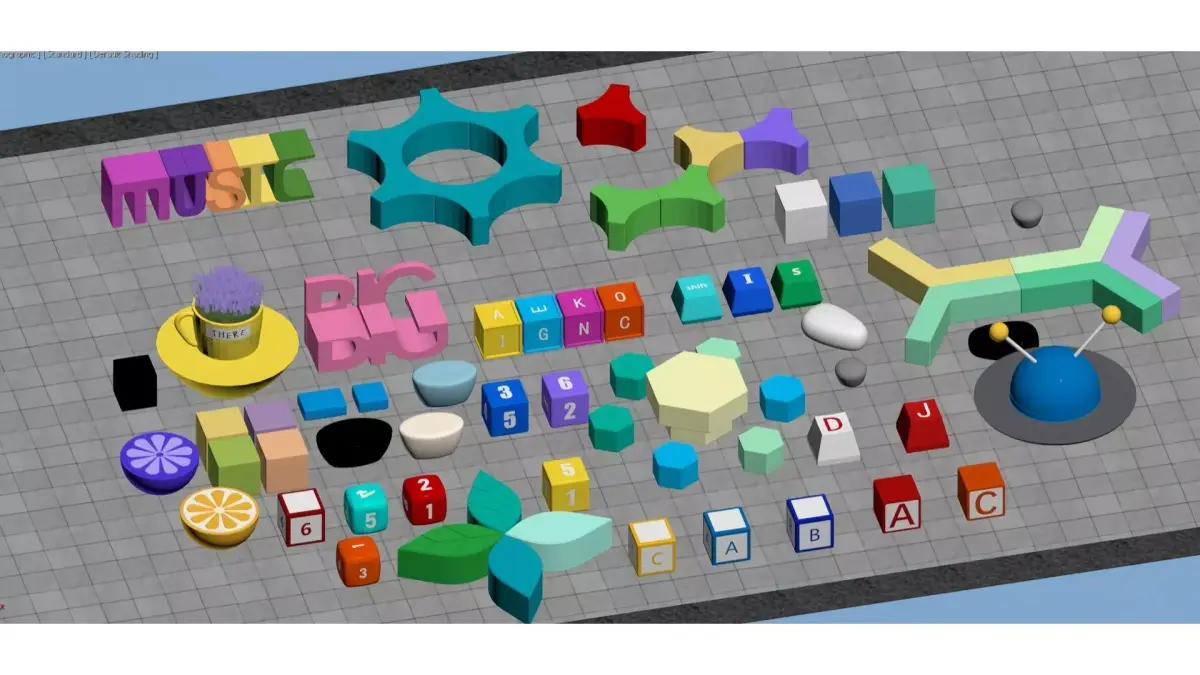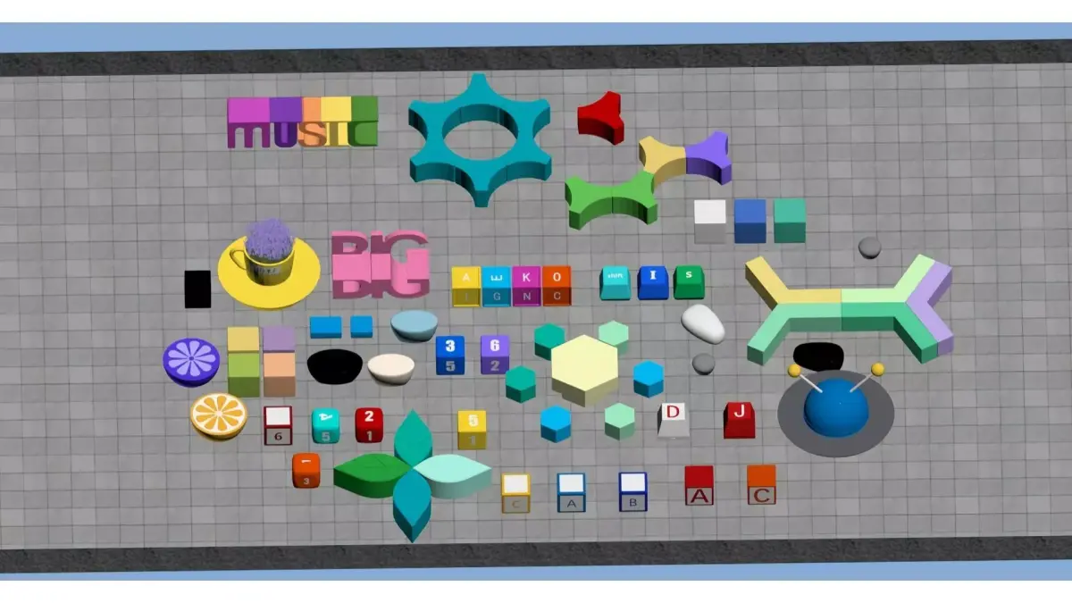 This is a 3D scene picture full of childlike fun, decorated with a variety of educational toy elements such as colorful building blocks, letter blocks and number blocks: 3D pink letters spelling BIG, decorative colorful letter ornaments spelling MUSIC, cubes marked with numbers/letters, and geometric components (star-shaped, petal-shaped, polygonal). These elements are paired with lovely decorations like lemon slices and cups. The overall picture features bright colors and rich shapes, presenting a lively style of children's educational toys/creative ornaments. It is suitable as a reference material for early education teaching aids or decorative elements.