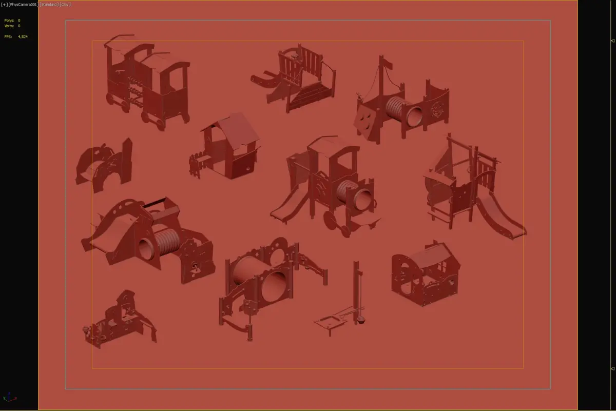 A collection of colorful themed playground structures, perfect for interactive and imaginative play. Includes trains, slides, tunnels, and more for endless fun.