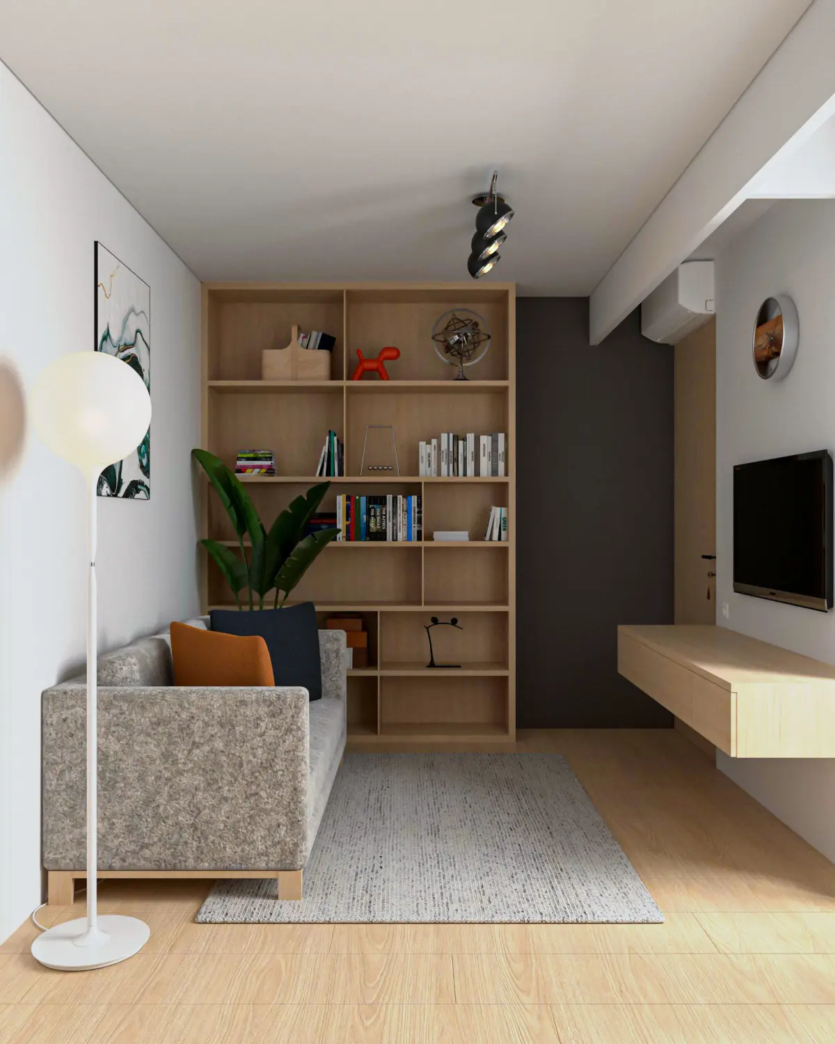 Step into a world where minimalism harmonizes with functionality, creating an oasis of productivity and tranquility. This home office design exemplifies the perfect blend of clean lines, natural textures, and contemporary aesthetics. The space is anchored by a sleek wooden desk that seamlessly integrates with the surrounding cabinetry, offering ample storage and an expansive workspace. The floating shelves adorned with carefully curated books and decor add a touch of personal flair, while the classic mid-century modern chair offers comfort and style. The muted color palette of soft earth tones, combined with the strategic use of black accents, adds depth and sophistication, creating an environment that inspires focus and creativity.
