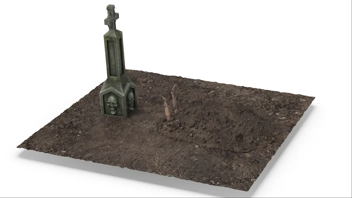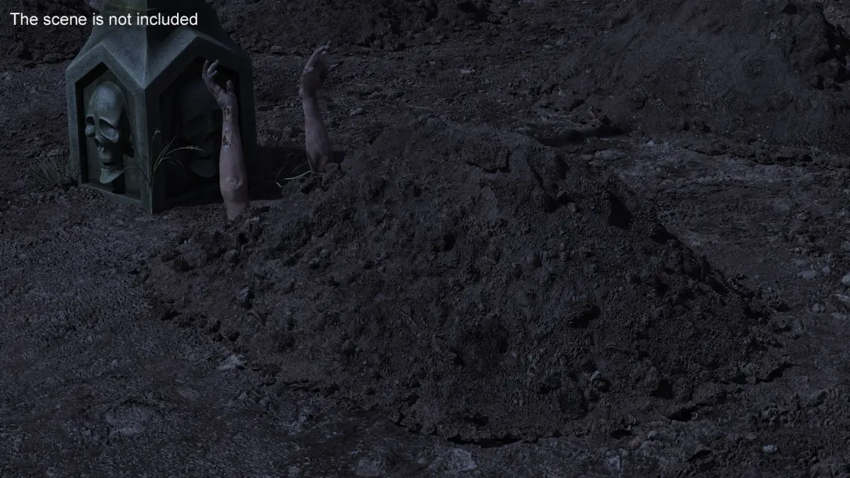 Creepy Cemetery Scene is a 3d model of an eerie graveyard setting, complete with zombie hands and atmospheric elements designed to evoke a chilling, haunted ambiance.