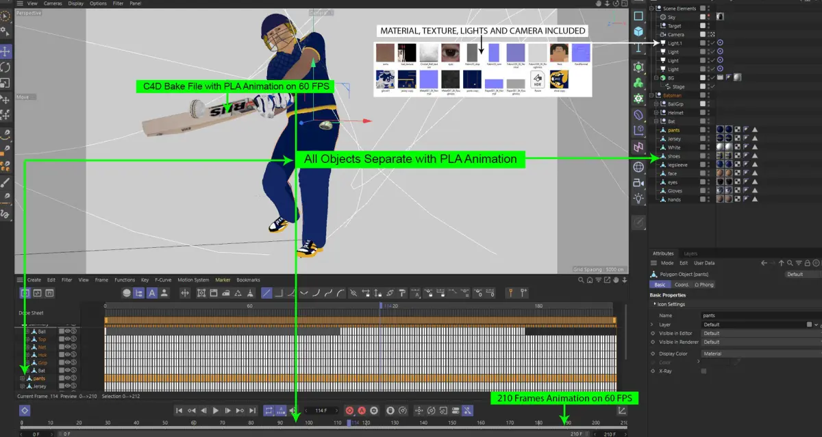 Animated Cricket Batsman / Batsman Hitting Shot with realistic animtion made in C4d. You can use in your projects just import in your scenes and hit render. its a complete 210 Frames realistic Animation, no plugins needed, its a 210 frames animation with vertex PLA Cache setup with lights, materials/textures and camera. All Character Elements are seperate in C4d file. its a Bake file not with character setup or with Rig.