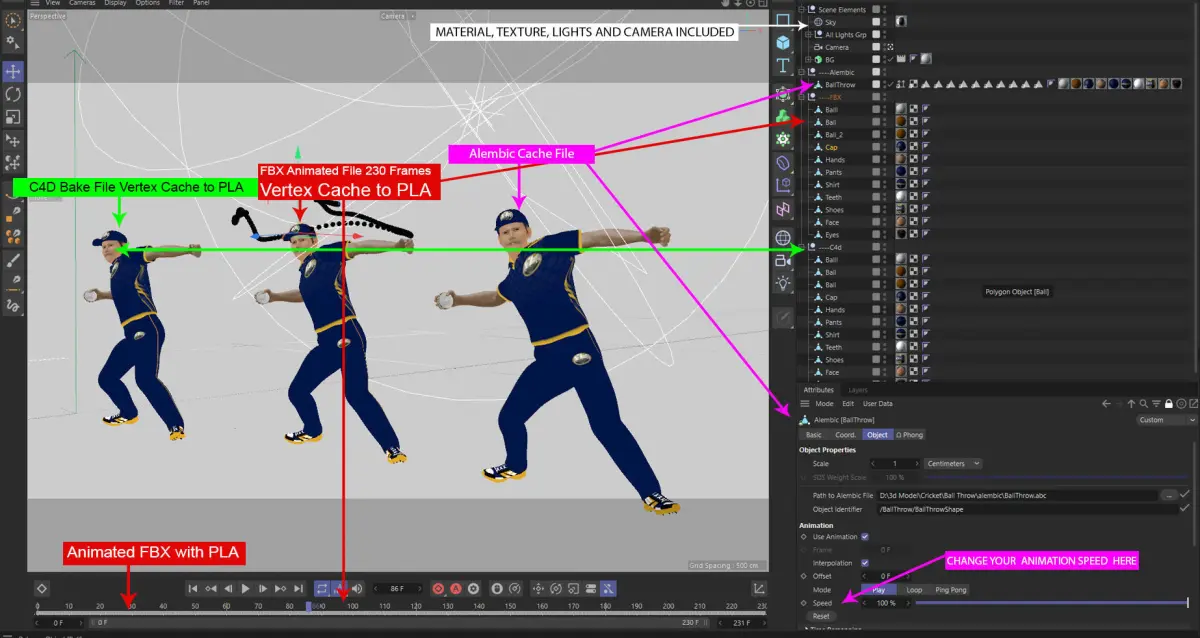 FBX Animated File with point cache animation and Animated ALEMBIC File are also include in the package. If you want Animated Ball Throwing Fielder for other 3d application please use Attached Alembic or Animated Fbx file. -- Note: Please Tick Check Vertex Cache to PLA when Import Fbx Animation.