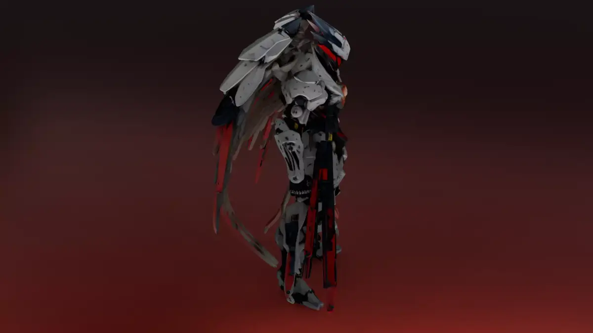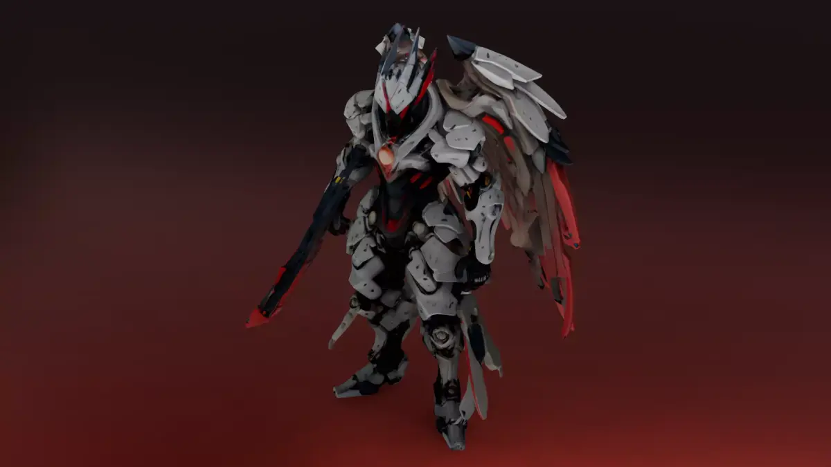 Its helmeted head design evokes a fallen seraph, with elongated horn-like fins and a faceless visor that enhances its intimidating aura. Red energy accents contrast with the cold metallic armor, giving the impression of contained rage and destructive potential. The asymmetrical weapon arm and reinforced limbs emphasize combat readiness and battlefield dominance.This model is ideal for sci-fi games, cinematic renders, dark fantasy concepts, and futuristic war scenes.Key Features:High-detail sci-fi mech designDemonic / fallen angel aestheticWinged mechanical back structureGlowing energy core and accentsSuitable for games, cinematics, and concept art