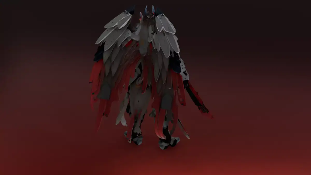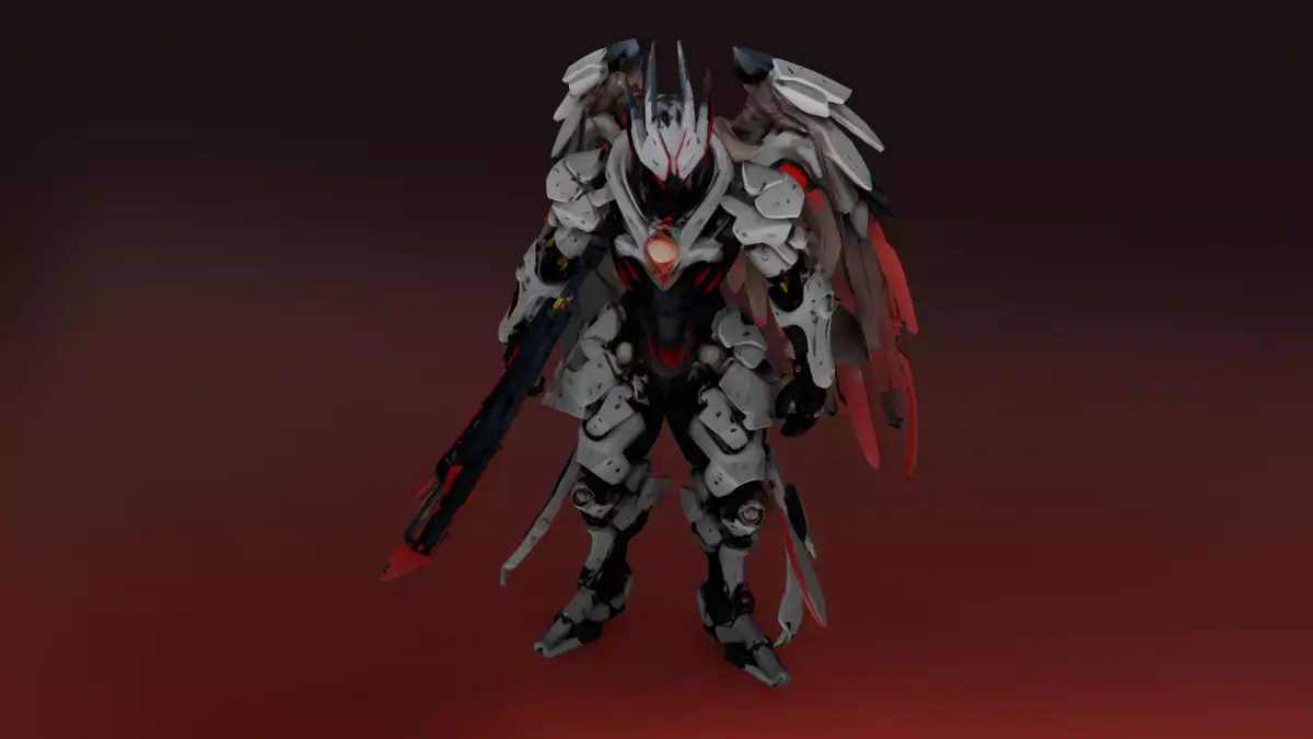 Crimson Seraph is a dark sci-fi mech entity inspired by demonic and angelic symbolism, blending advanced mechanical armor with an ominous, otherworldly presence. The model features heavy layered plating with sharp, aggressive silhouettes, wing-like structures extending from the back, and a glowing core embedded in the chest that suggests immense internal power.