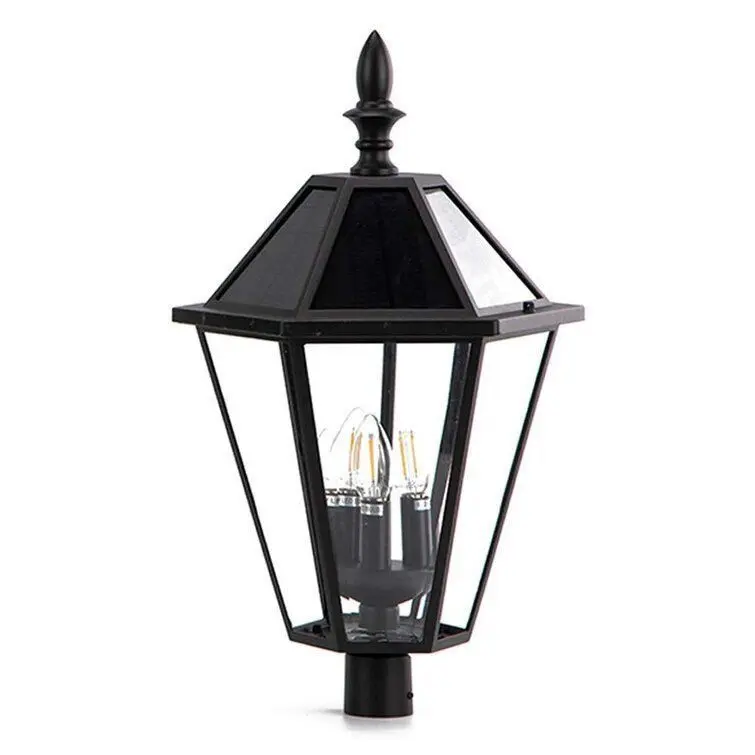 - Illuminate your outdoor space in tasteful, transitional style with this product of cast metal in a matte black finish, this lantern features a pitched, hexagonal roof, while clear, beveled glass panes ensconce three solar-powered candelabra bulbs to diffuse bright light as it’s dispersed throughout your patio or lawn.