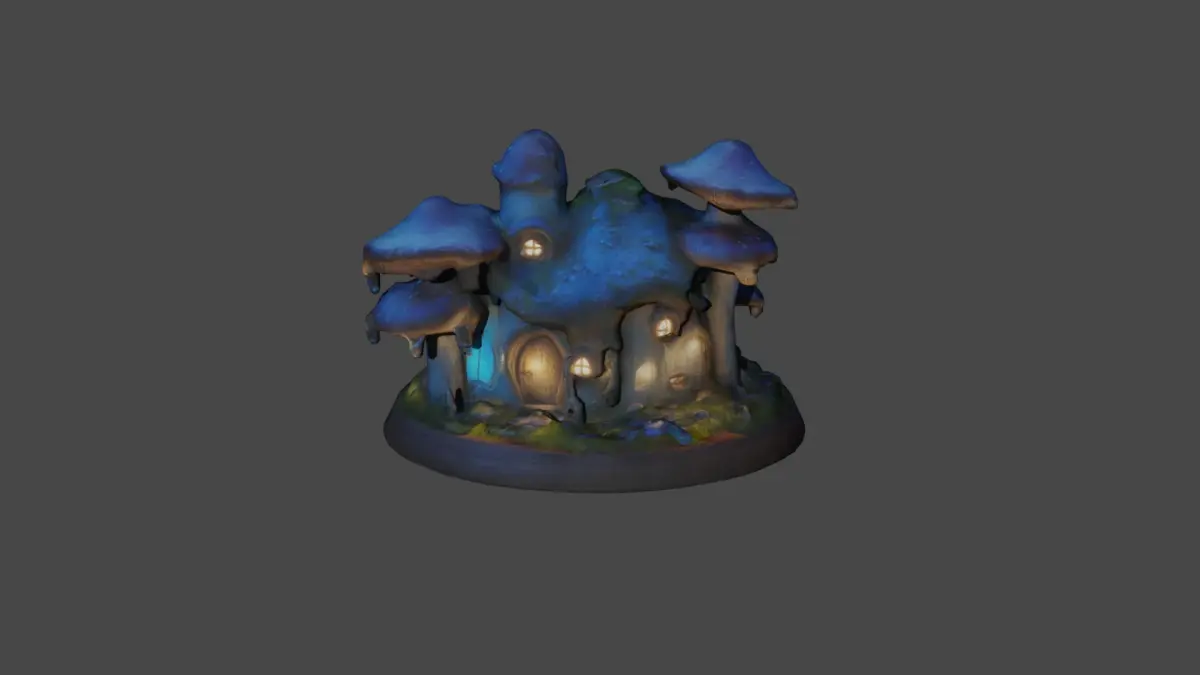Этот дом выполнен в синих тонах, окруженный высокими фантастическими грибами. Крыша покрыта мхом, а из окна горит мягкий свет.Модель имеет 15 000 полигонов, так что вполне подойдёт 3д печати.