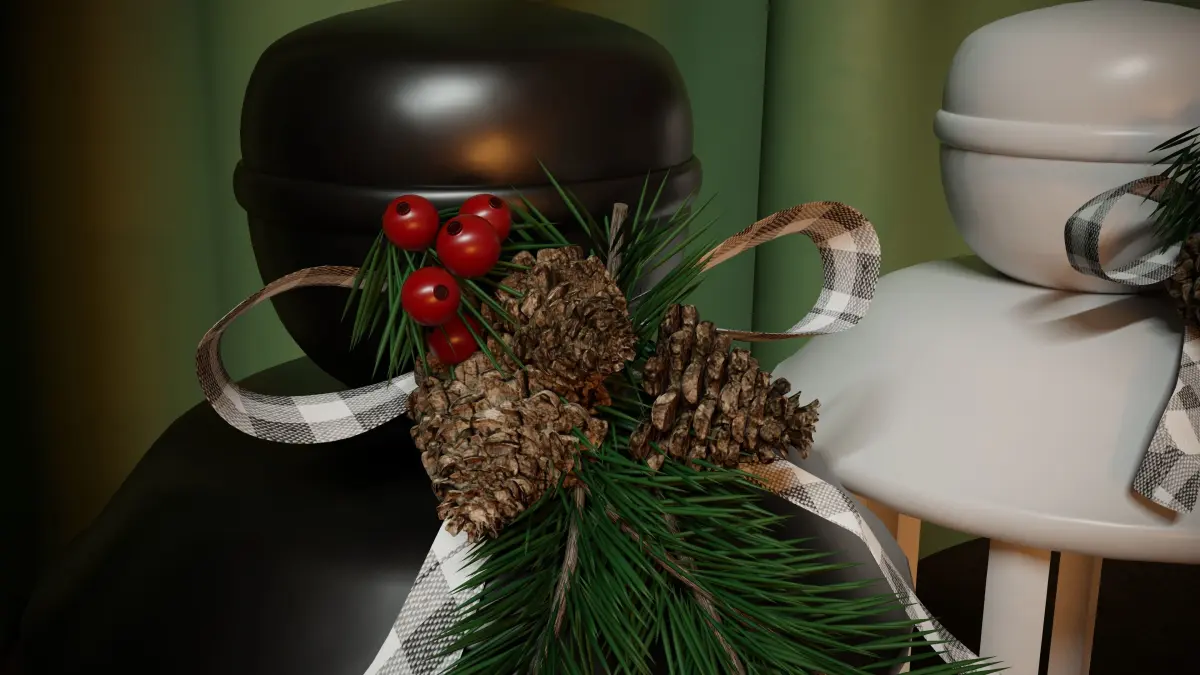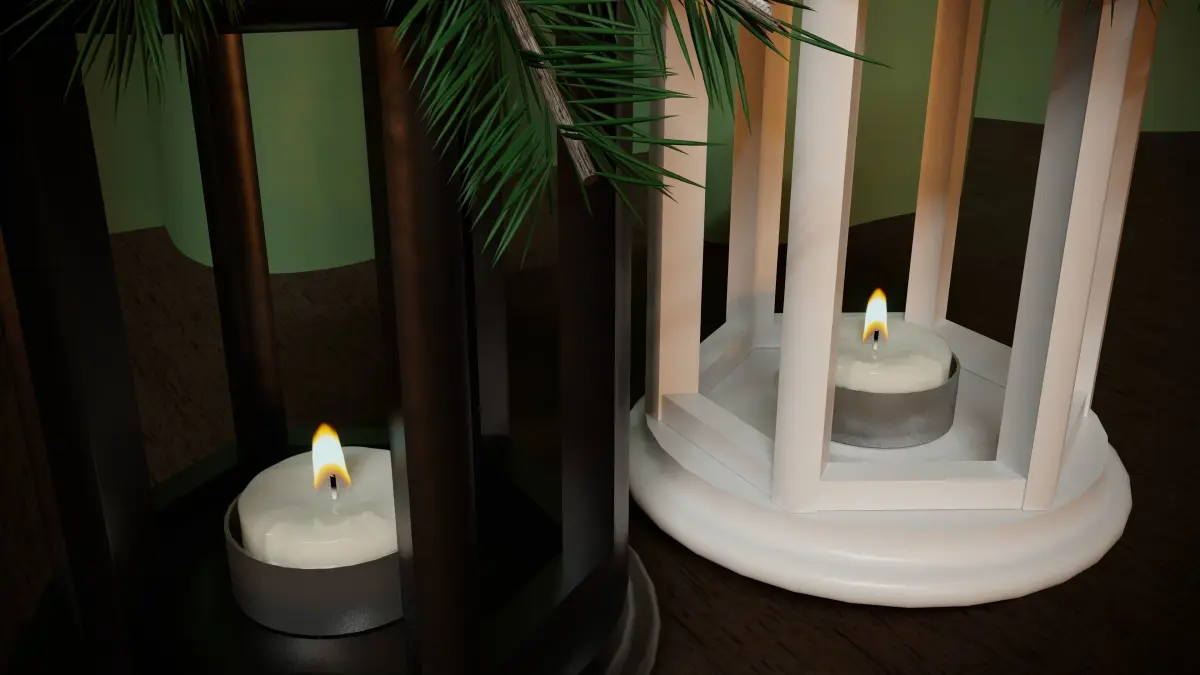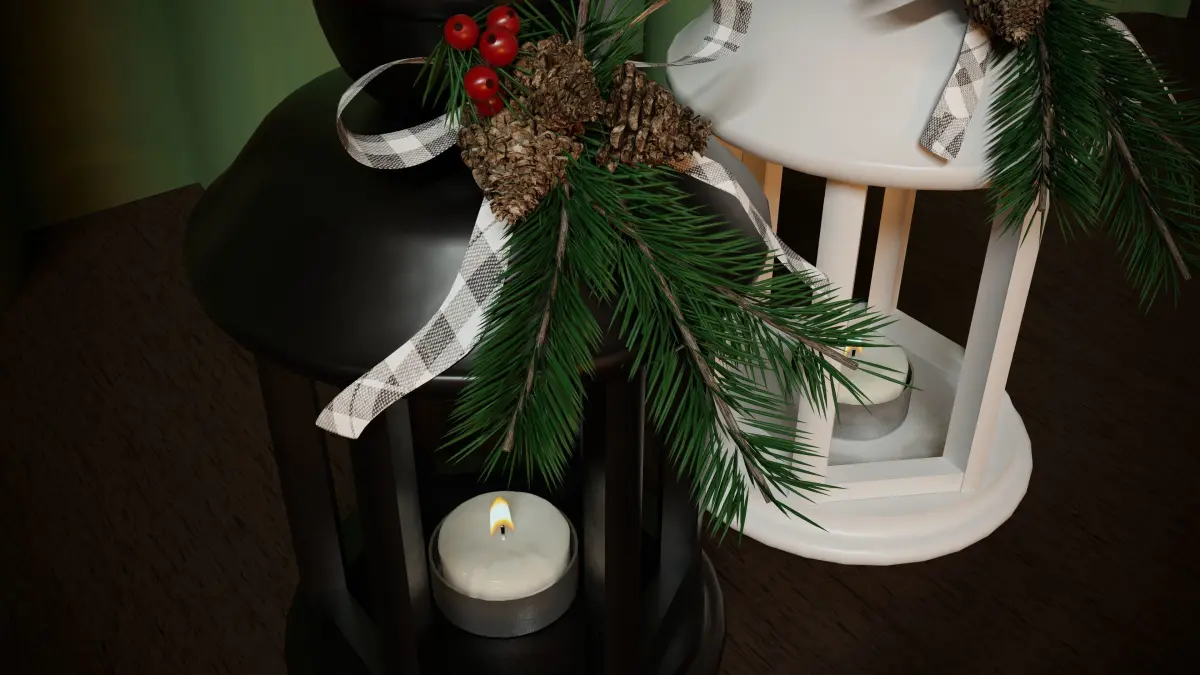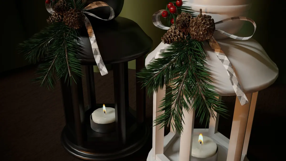 Two New Year flashlights with decoration of fir branches, a ribbon and little candles. Materials and textures included
