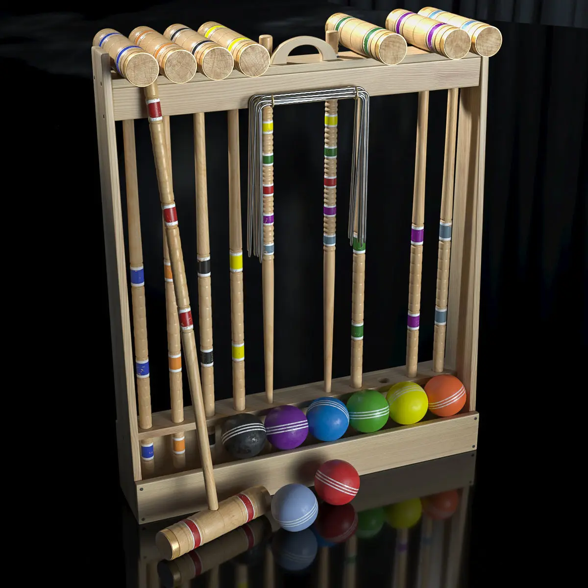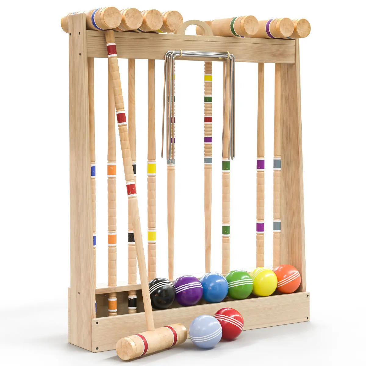 Deluxe croquet set for 8 players.Each croquet set contains 8 hardwood maple hammers that are lathe-turned and hand-painted into section rings to match the colors of the respective balls. Two brass rings adorn each end of the hammer head to prevent the wood from cracking. Two hardwood stakes are lathe-turned with multi-colored patches. The nine 5/32 diameter vinyl coated metal gates are very strong and not easy to bend. The 8 balls are made of plastic resin and are 3-5 / 16in diameter.The models are made for anti-aliasing, you can see the mesh in more detail.For a more correct display of textures, the Opensubdiv modifier is applied, render iters = 2The archive contains textures and files 3ds max 2020, 3ds max 2017, Coron, V-ray, as well as files fbx, obj, 3dsPolygons: 24 608Vertices: 25 037Manufacturer link:https://www.amishtoybox.com/products/deluxe-amish-crafted-wooden-pro-croquet-game-set