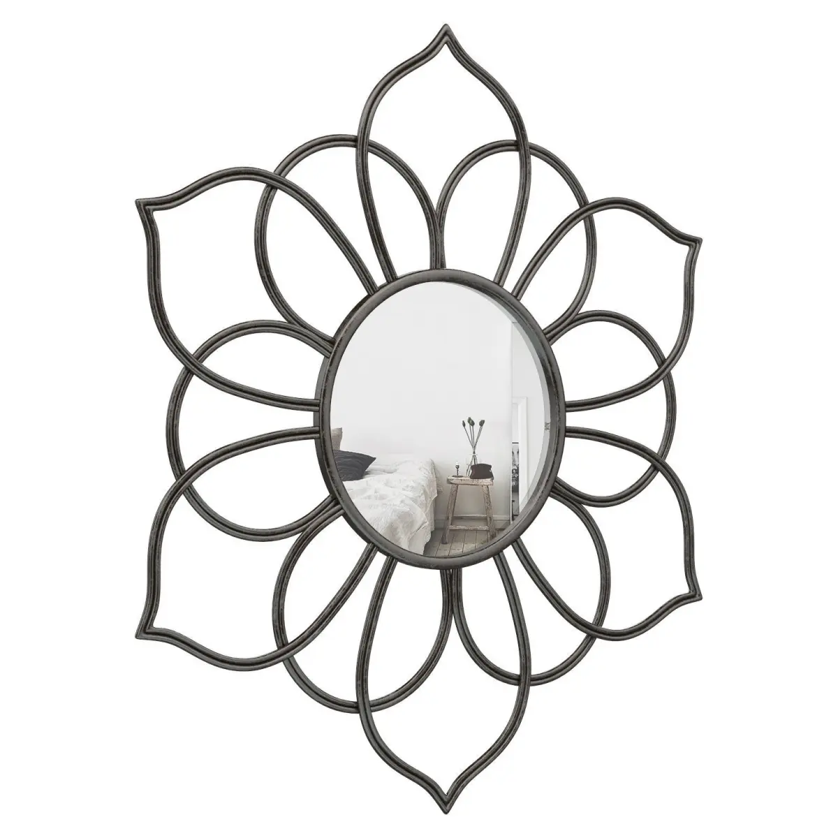 Constructed of a glass mirror and curved metal Decorative mirror is both functional and beautifully crafted metal wall art Hangers on back of mirror for easy wall display Metal flower wall mirror is a beautiful unique accent piece for your home decor