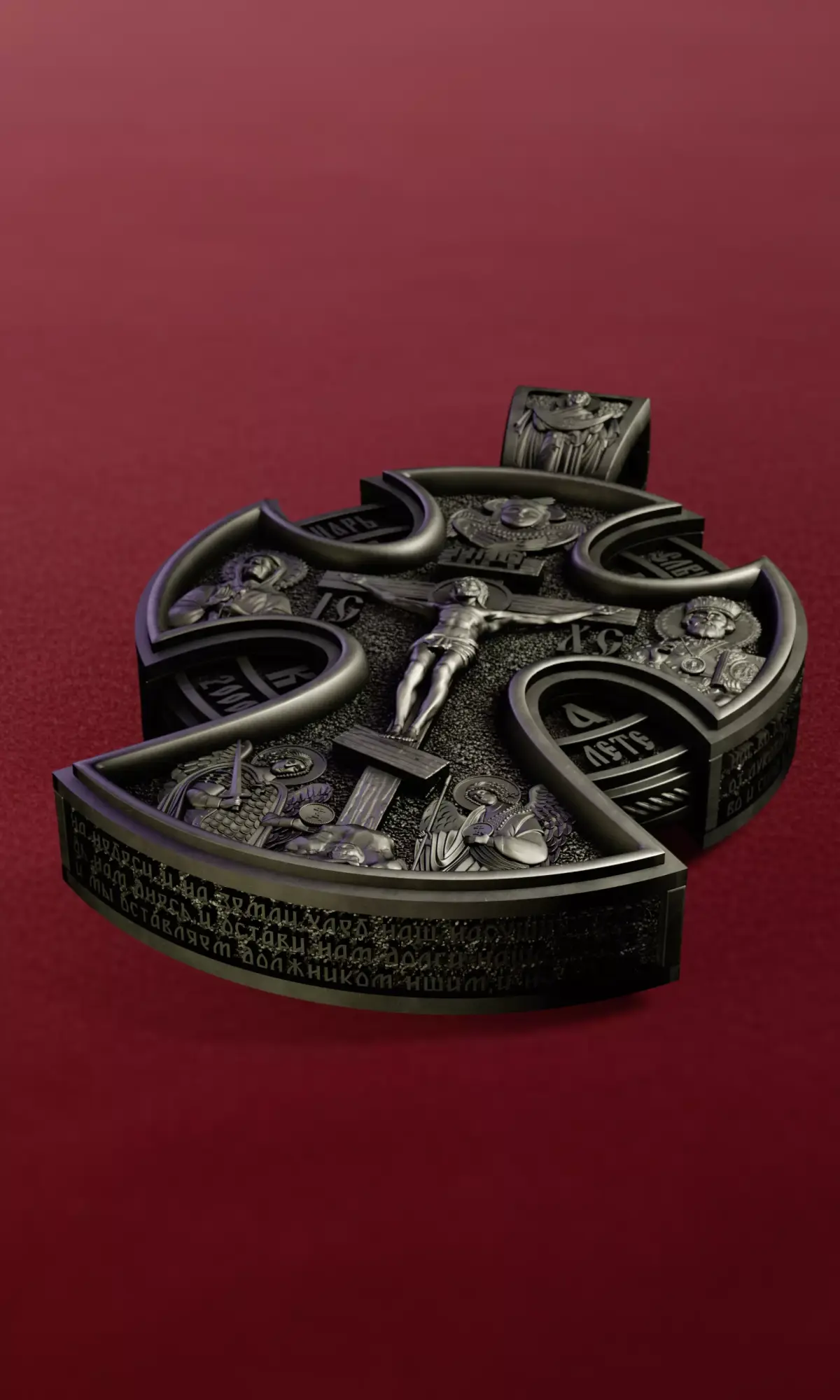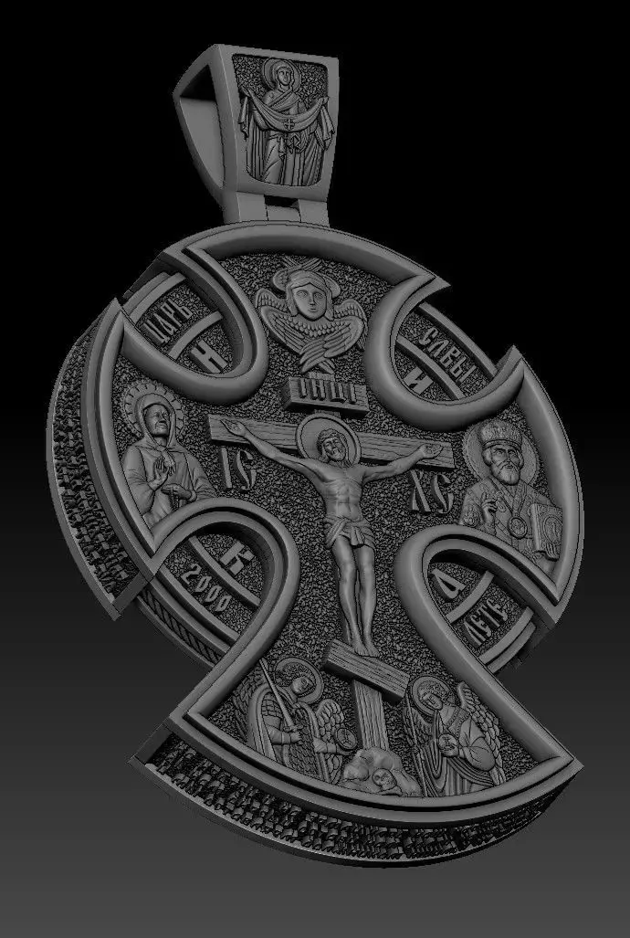 Highly detailed Orthodox cross pendant depicting the Crucifixion of Jesus Christ, surrounded by sacred figures and intricate relief ornamentation.The model is ideal for CNC engraving, jewelry production, 3D printing, or rendering projects.
