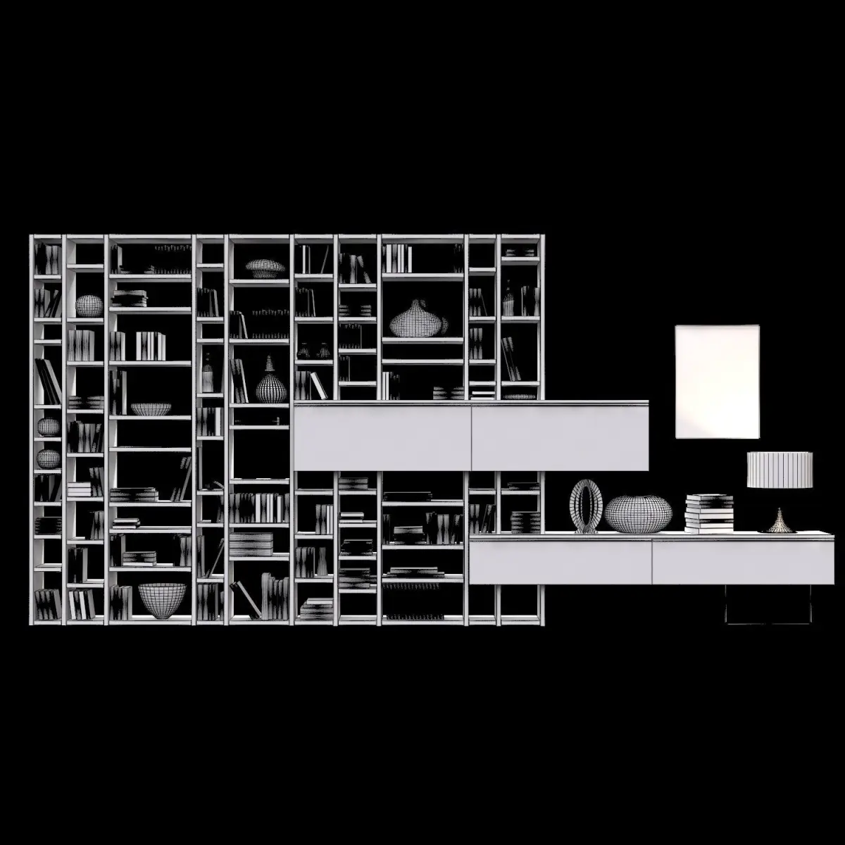 Name: CROSSING_bookcaseVersion: 2013Preview: YesUnits: MillimetersDimension: 462.01 x 5117.43 x 2503.43Polys: 164 021XForm: YesBox Trick: YesModel Parts: 395Render: V-RayFormats: 3Ds Max 2013, OBJ, FBX