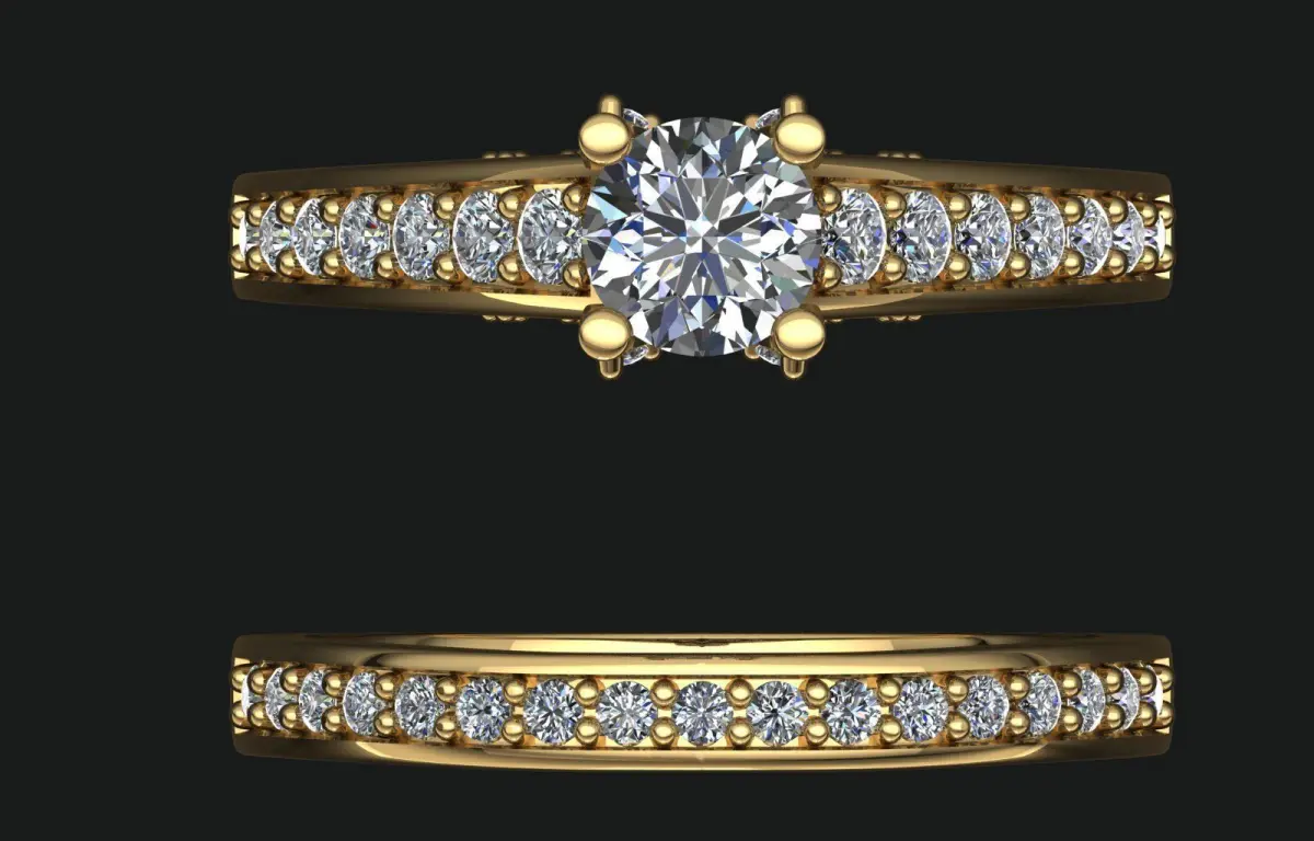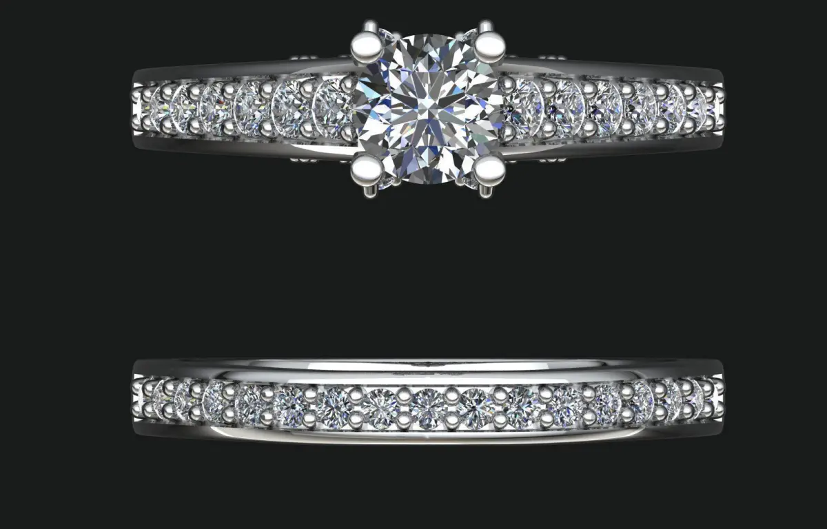 Center Stone Setting: Classic 4-prong claw setting for a solitaire diamond.Center Stone: 5mm round diamond.Side Stones:11 stones on each side of the center stone, 1mm round.7 stones on each side band, ranging from 2mm to 1.4mm round.Side Band Stones: 18 stones, 1.3mm round.Ring Size: UK Size J (scalable to other sizes upon request).File Formats: Includes .3dm and .stl files, ensuring compatibility with popular CAD software and 3D printing tools.Applications: