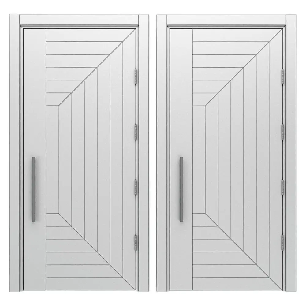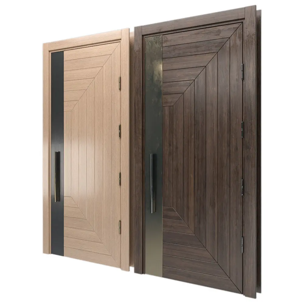 A custom door with a vertical steel band that combines horizontal and vertical wood planking to create a stunning modern clean design. Rendering shown in Rift White Oak.