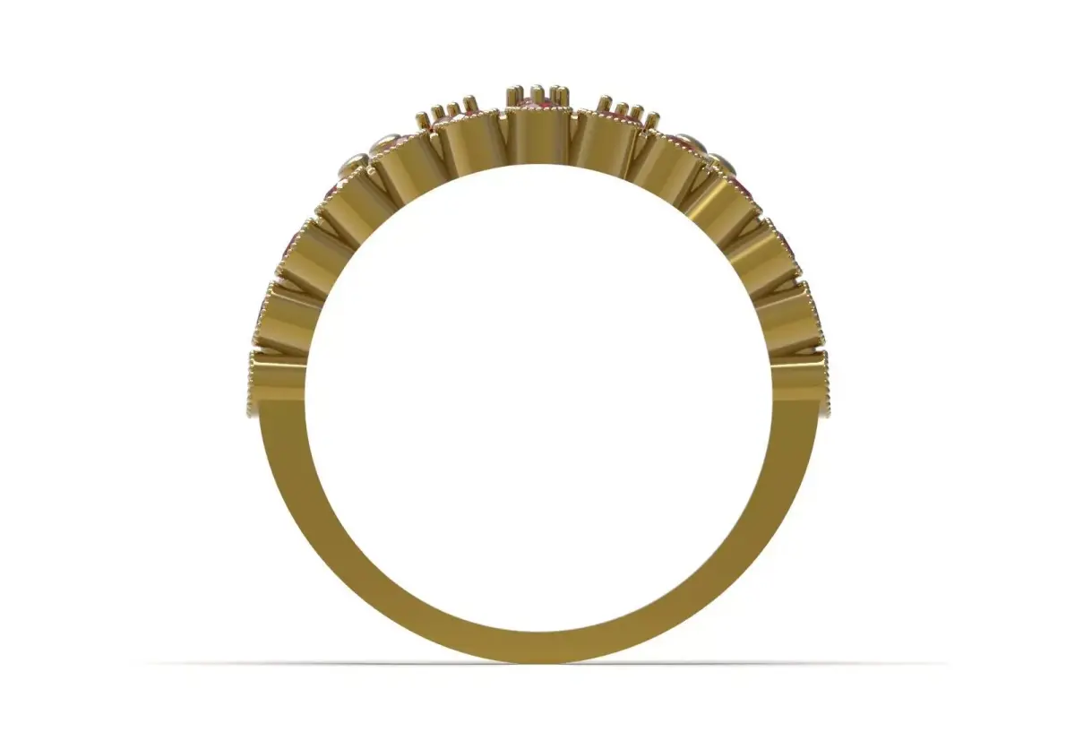 In short: This image is a preview of a CAD model of a Fantasy Crown Design ring with large red gems, which is being sold as a digital file for production.