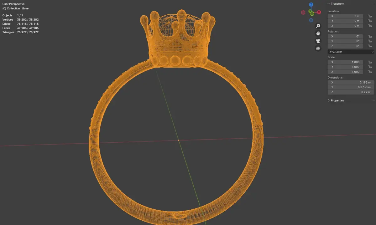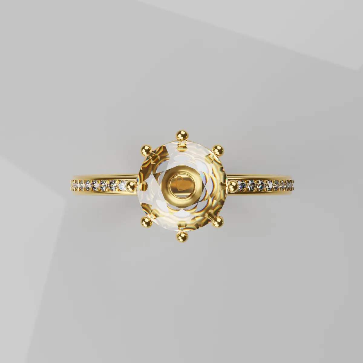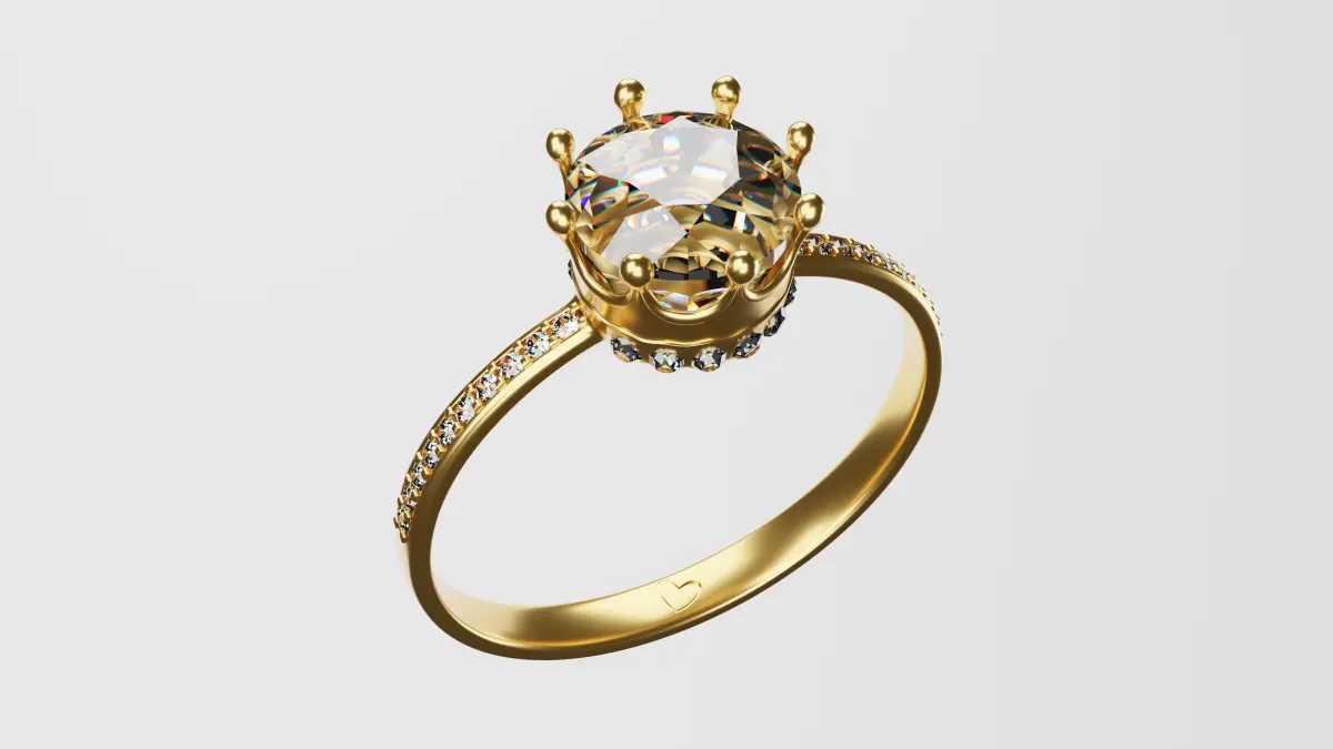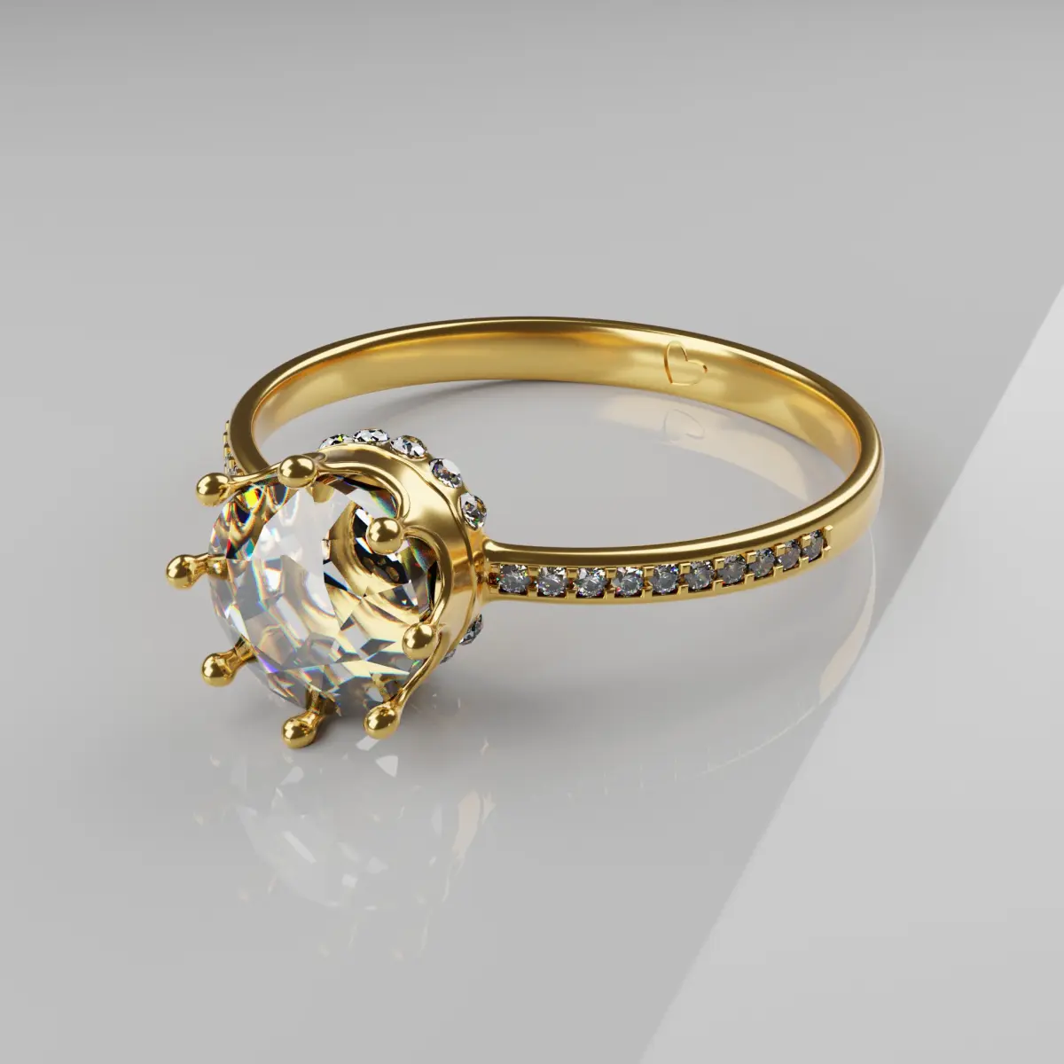 Model of a golden ring with a big diamond in the center, held by a crown.It's designed for highly detailed renders, marketing and to be used as a prop.For the native Blend file, I used a node based material for the diamonds, making them more shiny and colorful. For other file types, you're gonna need to edit it, using defraction to get the material looking like that.