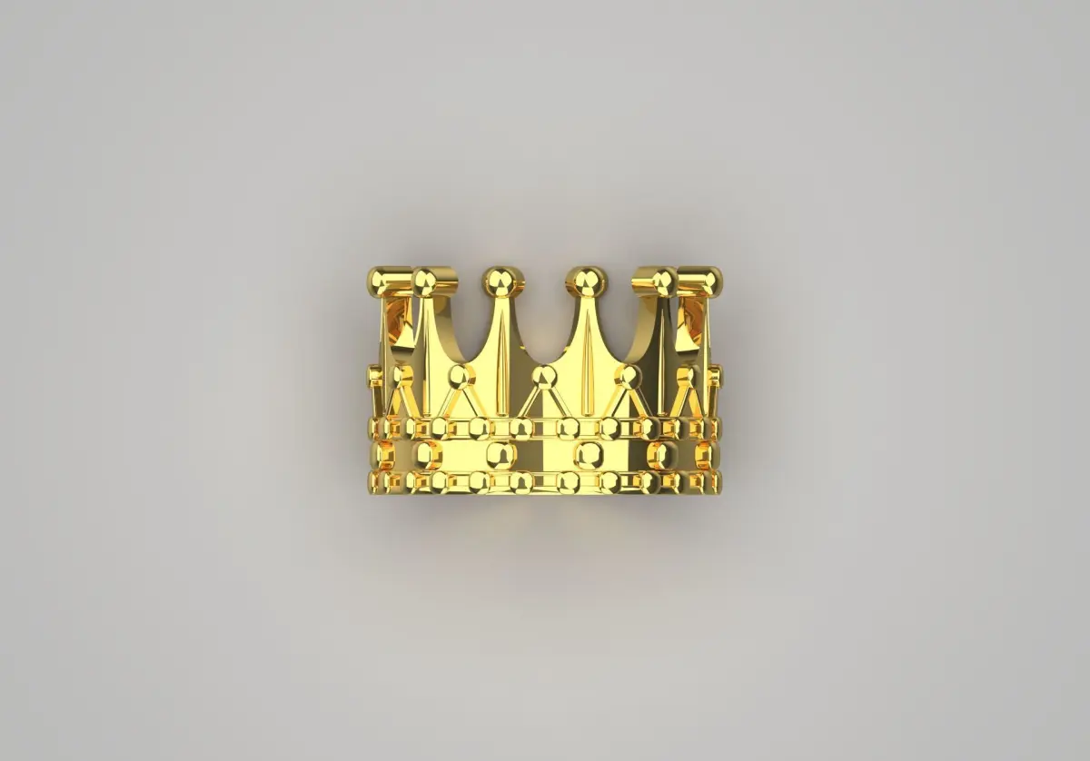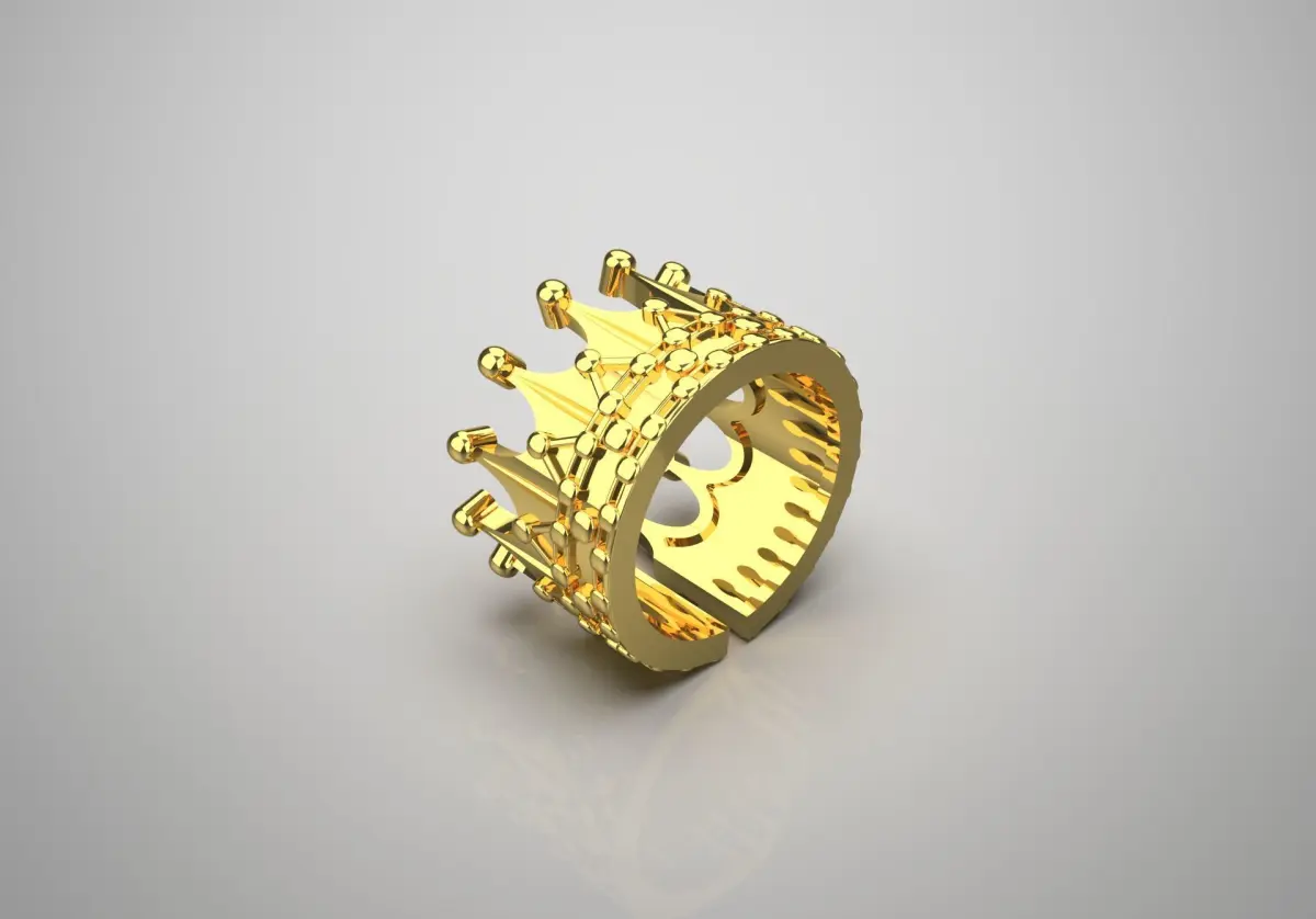 The image shows a beautiful gold ring with an interesting design. This ring is designed in the shape of a crown and has a prominent structure that represents power and beauty. On the top of the ring, the tips of the crown are delicately and beautifully shaped, and its golden shine conveys a sense of luxury and elegance.
