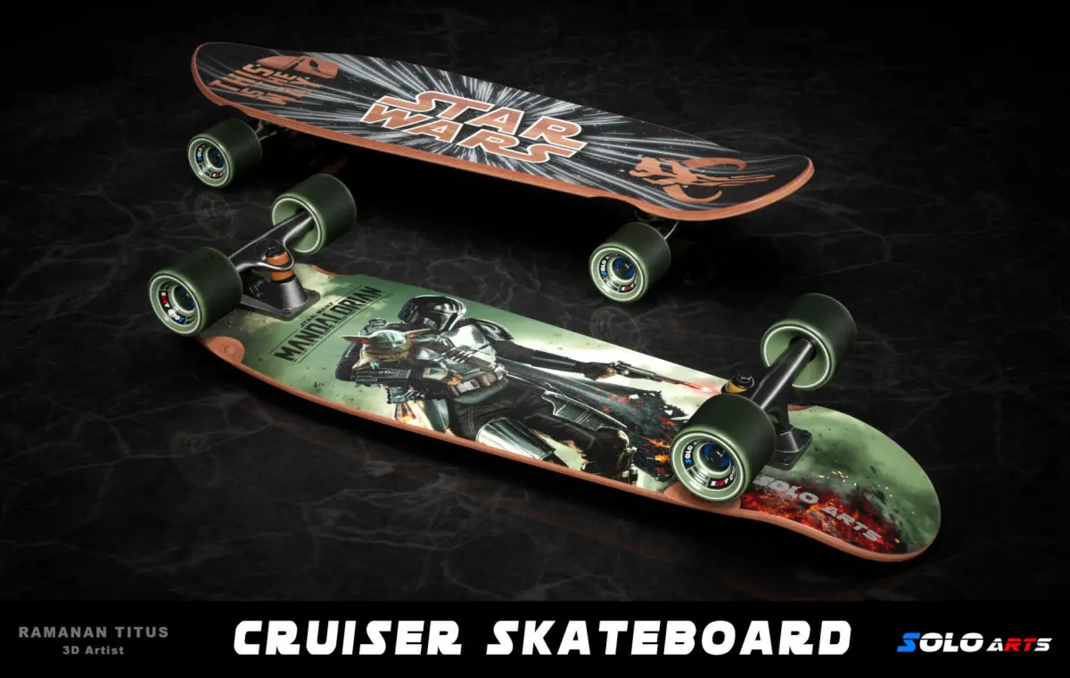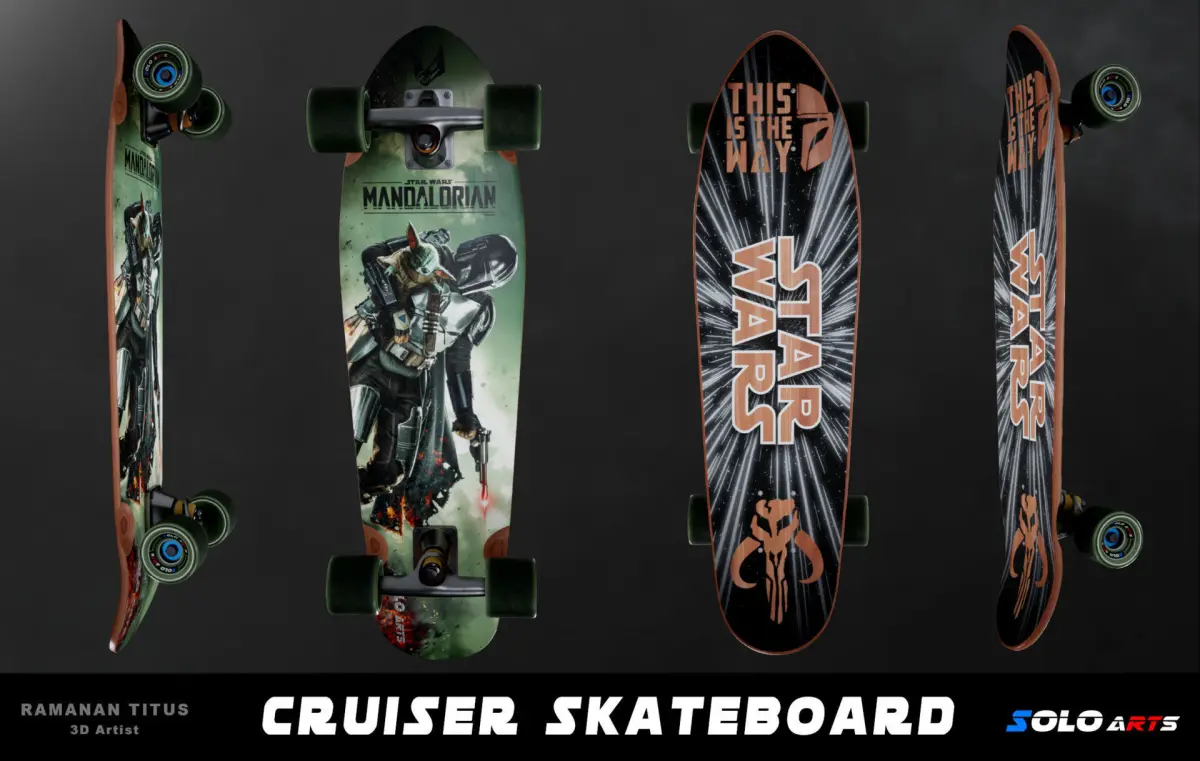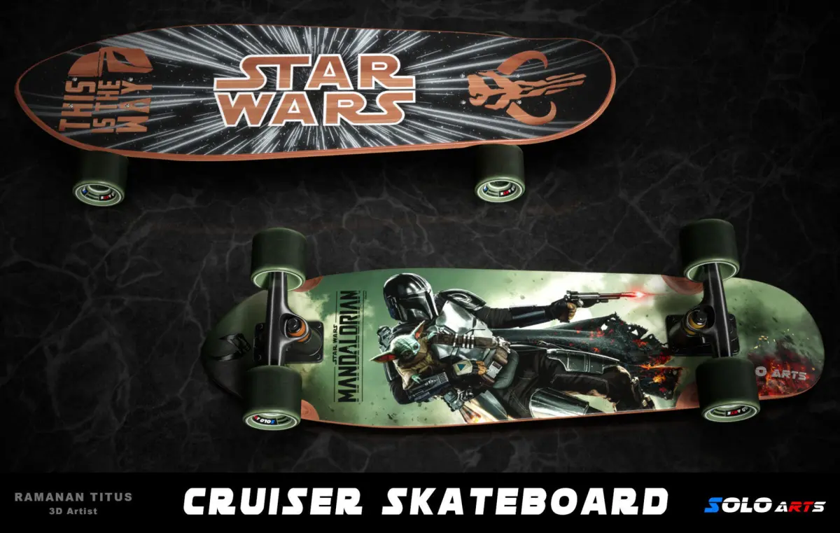 his is a Highly detailed and realistic Cruiser skateboard with Mandalorian Graphics. This model is READY FOR PRODUCTION.