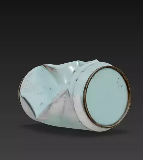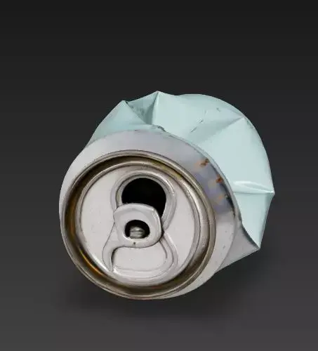 Heavy Structural Deformation The geometry is heavily modified from a standard cylinder. The body features deep, irregular buckles and creases where the metal has collapsed inward, capturing the specific way thin aluminum folds under pressure.