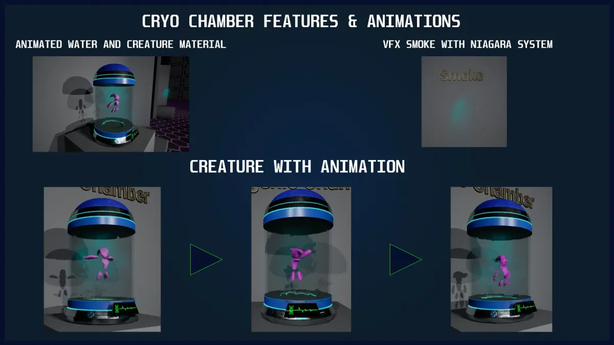 Creature: The creature has animation. I created a blueprint where, when there is proximity, the creature starts an animation and repeats it three times. After moving away, it stops. The creature's material is also animated, it flashes emissive colors.Animated Water: I programmed the water material to animate it.Blue Smoke: Blue smoke made with Niagara System to complement the Cryogenic Chamber.Everything with UVs and lightmap ready.Textures in 2k resolutionSimple README included with tutorial on how to use in Unreal EngineTriangles Count: 10.944 triangles for all Along with the file, I am sending a video with an overview of the asset in action.It is necessary to enable the 3D Text and GPU Lightmass plugins.