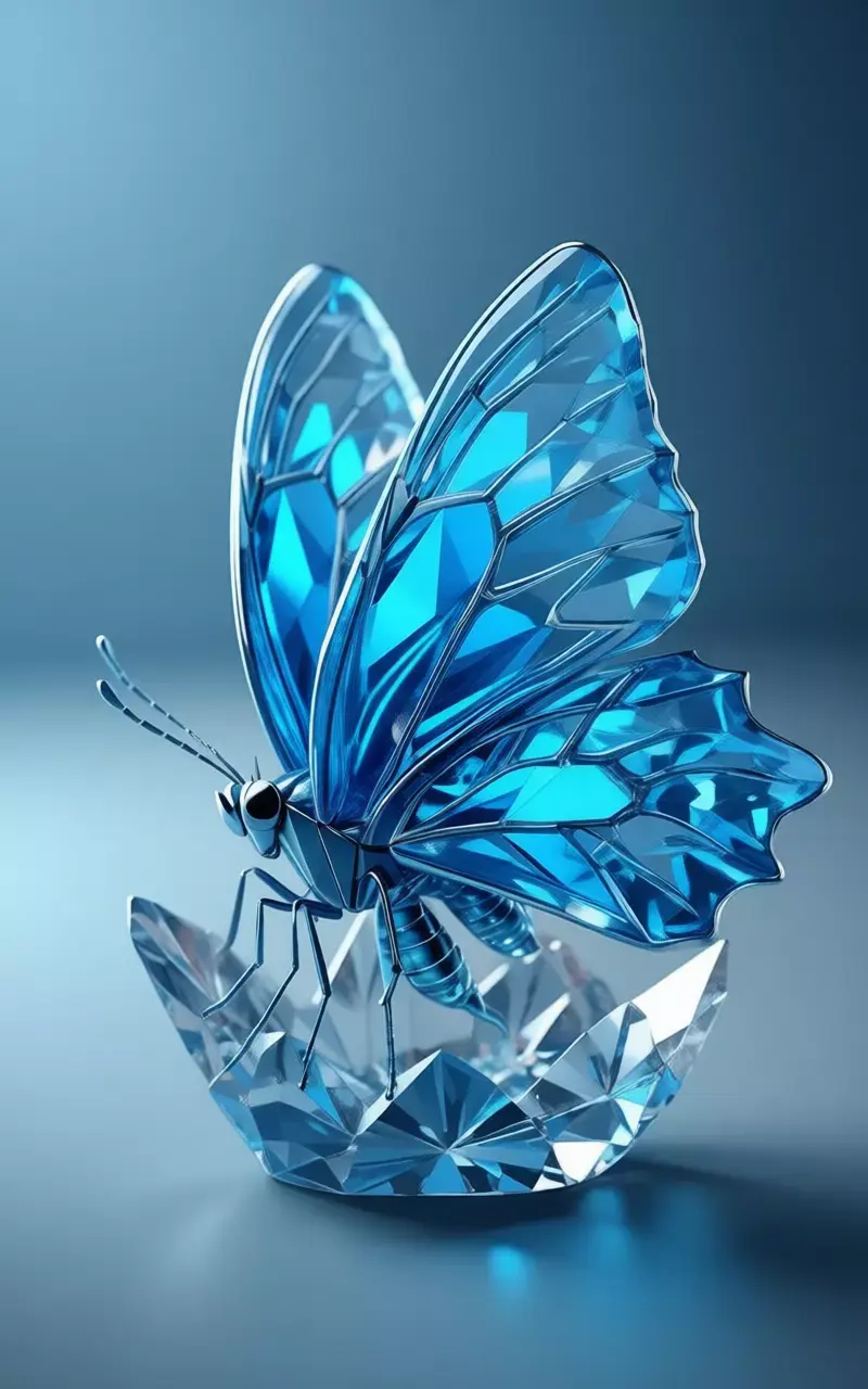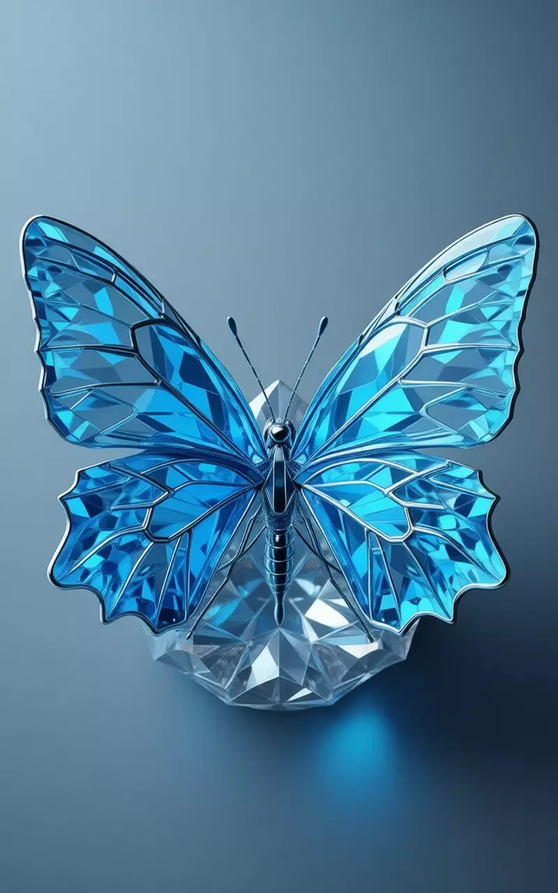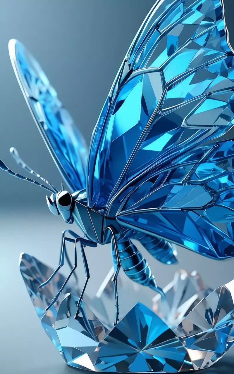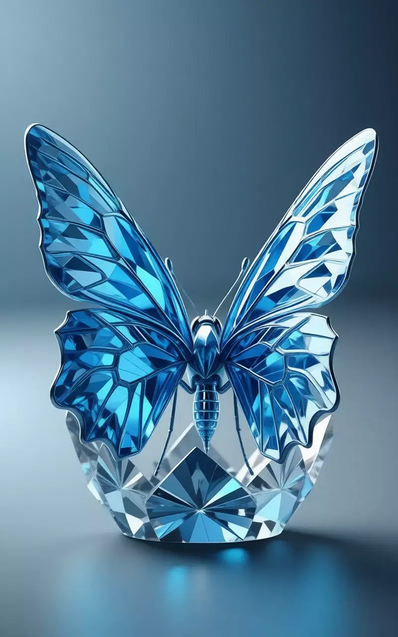 it is a breathtakingly detailed, hyper-realistic 3D asset that captures the very essence of a fantastical creature forged from pure, luminous crystal, rendered with such astonishing fidelity and artistic mastery that it seems to shimmer and glow with an inner light, presented against a smooth, gradient gray background that serves to isolate the sculpture and elevate it to the status of a priceless gemstone artifact, making it an ideal centerpiece for any creative project requiring a symbol of beauty, fragility, transformation, and the intersection of nature and artifice. The butterfly itself is a masterpiece of geometric precision and ethereal elegance, its entire form constructed from translucent, deep sapphire-blue crystal that has been meticulously faceted to mimic the intricate structure of real butterfly wings while simultaneously evoking the brilliance of a cut diamond. Every surface, from the delicate, veined patterns of the wings to the slender, segmented body and the fine, articulated legs, is covered in a complex network of sharp, angular facets that catch and refract the ambient light, creating a dazzling display of internal reflections, prismatic rainbows, and sparkling highlights that dance across its surface as the viewer's perspective shifts. This brilliant blue crystal is contrasted subtly with accents of polished, dark metallic silver on the central veins of the wings, the antennae, and the joints of the legs, adding a touch of structural definition and sophistication without detracting from the overall sense of delicate, crystalline purity. The wings are fully extended, their vast span showcasing the incredible complexity of the faceting, with each individual facet acting like a tiny mirror, reflecting the surrounding environment and creating a sense of depth and dimensionality that is truly mesmerizing. The body is slender and graceful, tapering to a point at the tail, with a smooth, glossy finish that contrasts with the faceted wings, while the head features two large, perfectly round, black eyes that provide a focal point and a hint of life to the otherwise inanimate sculpture. The butterfly is perched delicately on a matching, faceted crystal base, which is shaped like a large, abstract flower or perhaps a stylized leaf, providing a stable foundation and enhancing the overall aesthetic of the piece. The entire sculpture is positioned at a dynamic three-quarter angle, allowing viewers to appreciate its full profile, from the pointed tips of the upper wings to the intricate details of the lower wings and the delicate curve of the tail, showcasing its balanced proportions and attention to anatomical detail. The lighting is expertly controlled, simulating the soft, diffused light of a high-end jewelry display, casting subtle shadows beneath the sculpture that provide a sense of weight and presence on the surface, while the specular highlights on its glossy surfaces are perfectly rendered to mimic the reflection of a real-world environment, enhancing the perception of its premium materials and flawless finish. This level of photorealism makes the asset indistinguishable from a high-end product photograph, offering unparalleled flexibility for designers, marketers, and content creators seeking to convey a message of luxury, refinement, and the transformative power of art. It is a powerful visual metaphor for the beauty of nature captured and preserved in a permanent, enduring form, a symbol of metamorphosis, grace, and the delicate balance between strength and fragility. Whether used in advertising campaigns for luxury brands, promotional materials for jewelry or fashion, editorial content about art and design, video game assets for fantasy worlds, or architectural visualizations of high-end interiors, this crystal butterfly stands as a testament to human ingenuity and the enduring desire to capture and celebrate the fleeting beauty of the natural world. Its design is not just about function; it is a statement of elegance, a declaration of the existence of a world where the boundaries between organic and synthetic blur in the most exquisite and captivating of ways. The sheer quality of the rendering, from the subtle reflections in the crystal to the precise detailing of the facets and the texture of the base, speaks to the immense skill and dedication of the artist who created it, making it a valuable asset for any project that demands the highest standards of visual excellence and emotional impact. The image evokes a profound sense of awe and wonder, inviting viewers to imagine the coolness of the crystal, the play of light across its surface, and the feeling of holding a piece of frozen magic in their hands. It is a vision of a world where the ephemeral is made eternal, where the beauty of a butterfly is captured not in a moment, but in a timeless, radiant form that will continue to dazzle and inspire for generations to come.