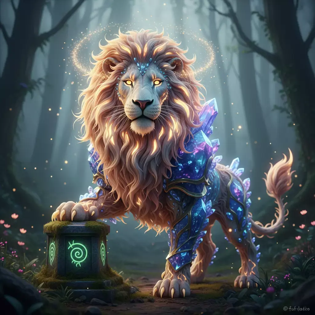 The Crystal Lion Guardian is a majestic fantasy creature blending regal leonine form with luminous crystalline armor. Its flowing mane glows with ethereal light, while faceted crystal growths and ornate arcane plating shimmer across its body, giving the impression of a powerful magical protector awakened from an ancient forest.