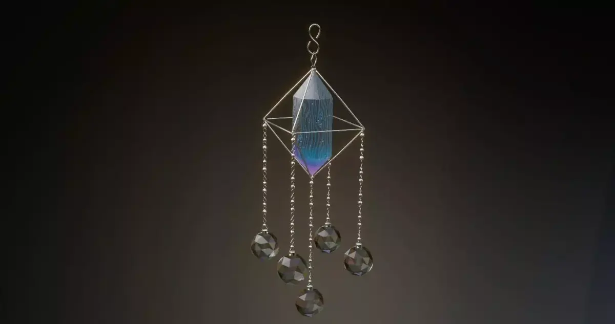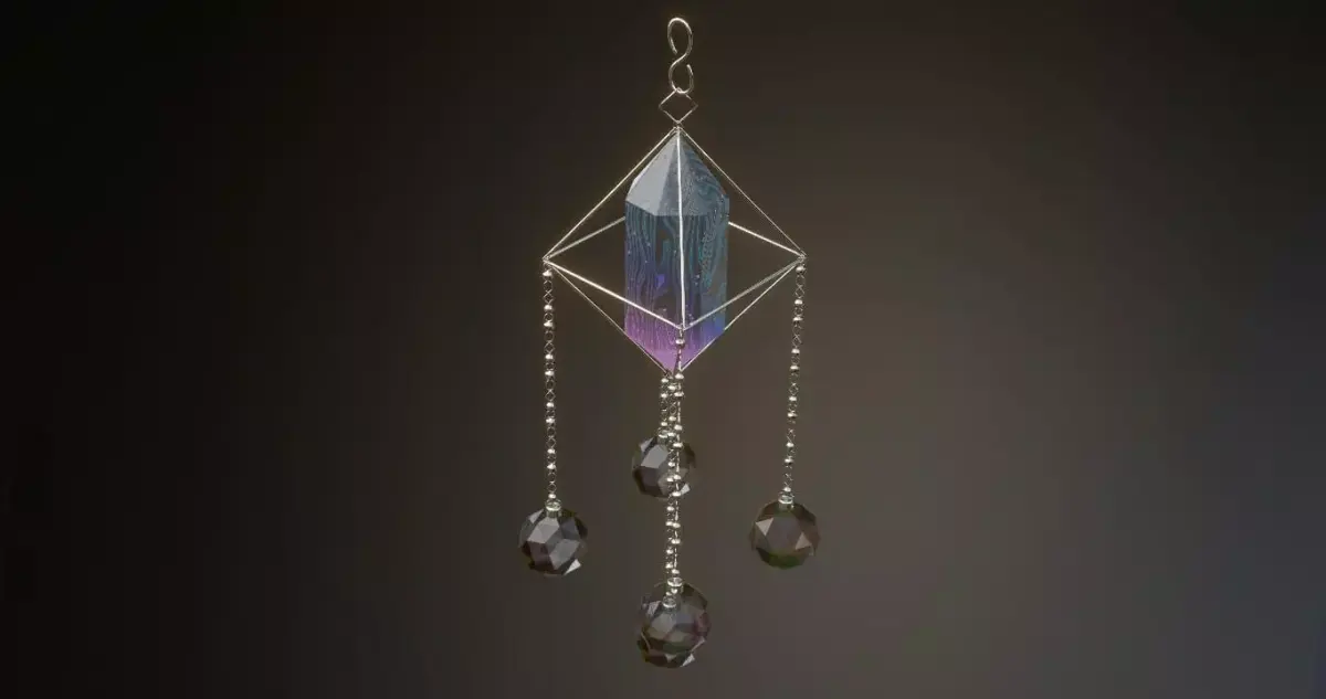This 3D model represents a crystal suncatcher wind chime, combining decorative prism elements with hanging drops that mimic a wind chime aesthetic. It features a metal frame, a central faceted crystal prism, and five smaller crystal spheres suspended by chains.