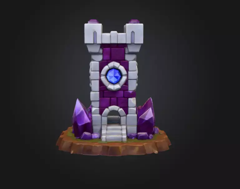 Crystal Tower is a stylized magical structure designed to serve as a key building in fantasy worlds. Built from solid stone bricks reinforced by luminous purple crystals, this tower stands as a defensive fortress and an arcane power source. At its heart, embedded into each wall, a radiant blue gem focuses magical energy, hinting at its role in channeling protection spells, powering magical shields, or guarding enchanted territory.