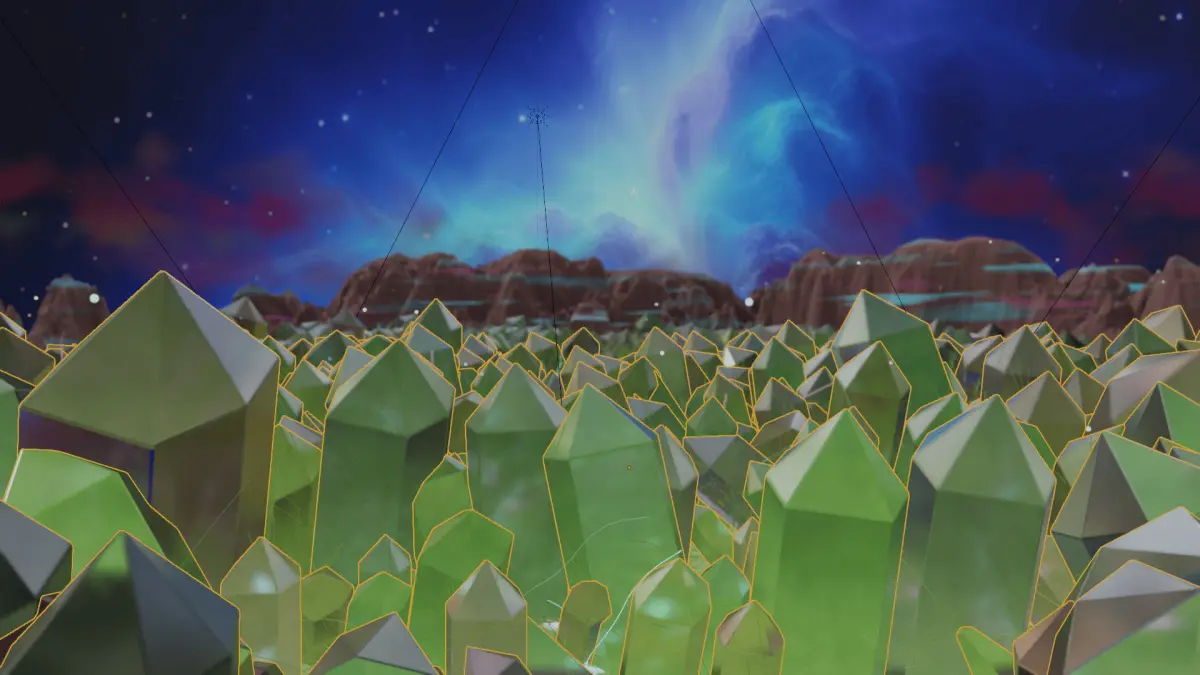A Sci-Fi scenery with crystals growing in nature with a view of mountains and nebula.