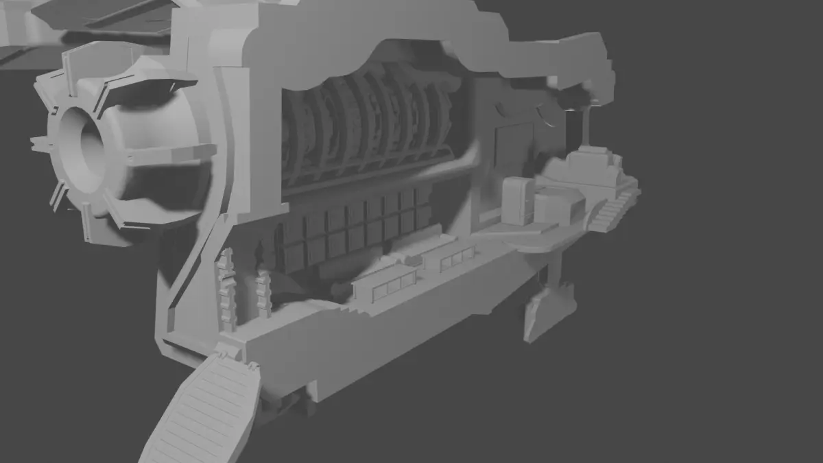 Concept starship freighter designed in Plasticity with high exterior and interior detail. General exterior design inspired by drop ship in Andor series. Design prototype was fabricated on an Elegoo Mars system with images of resultant print displayed. Images include stills from GravitySketch on Oculus Quest VR headset. Model was simultaneously published to YouTube and DeviantArt under the same title.