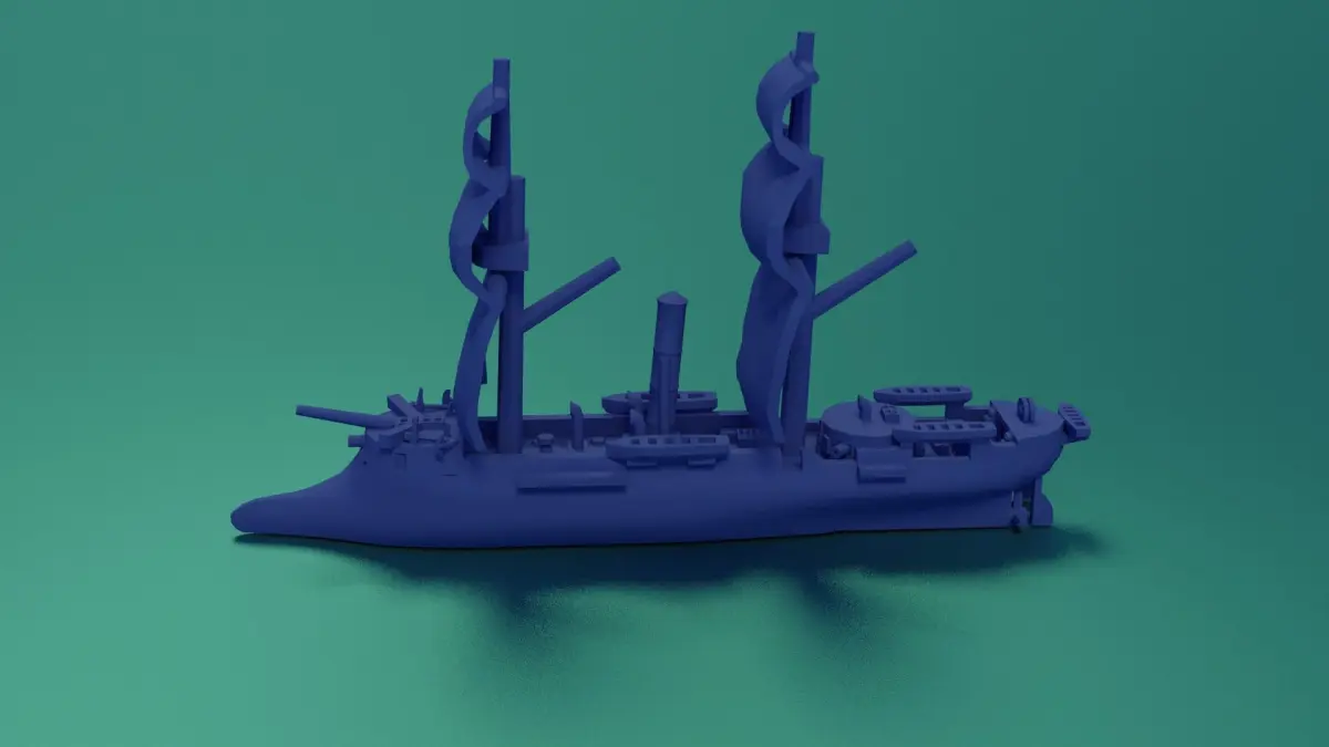 2° model, 13.9cm (139mm), including her naval ram. x 3.6cm (36mm) x 7.9cm (79mm). Scale: 1/500. (File CSS Stonewall 1864 (1_500).zip).