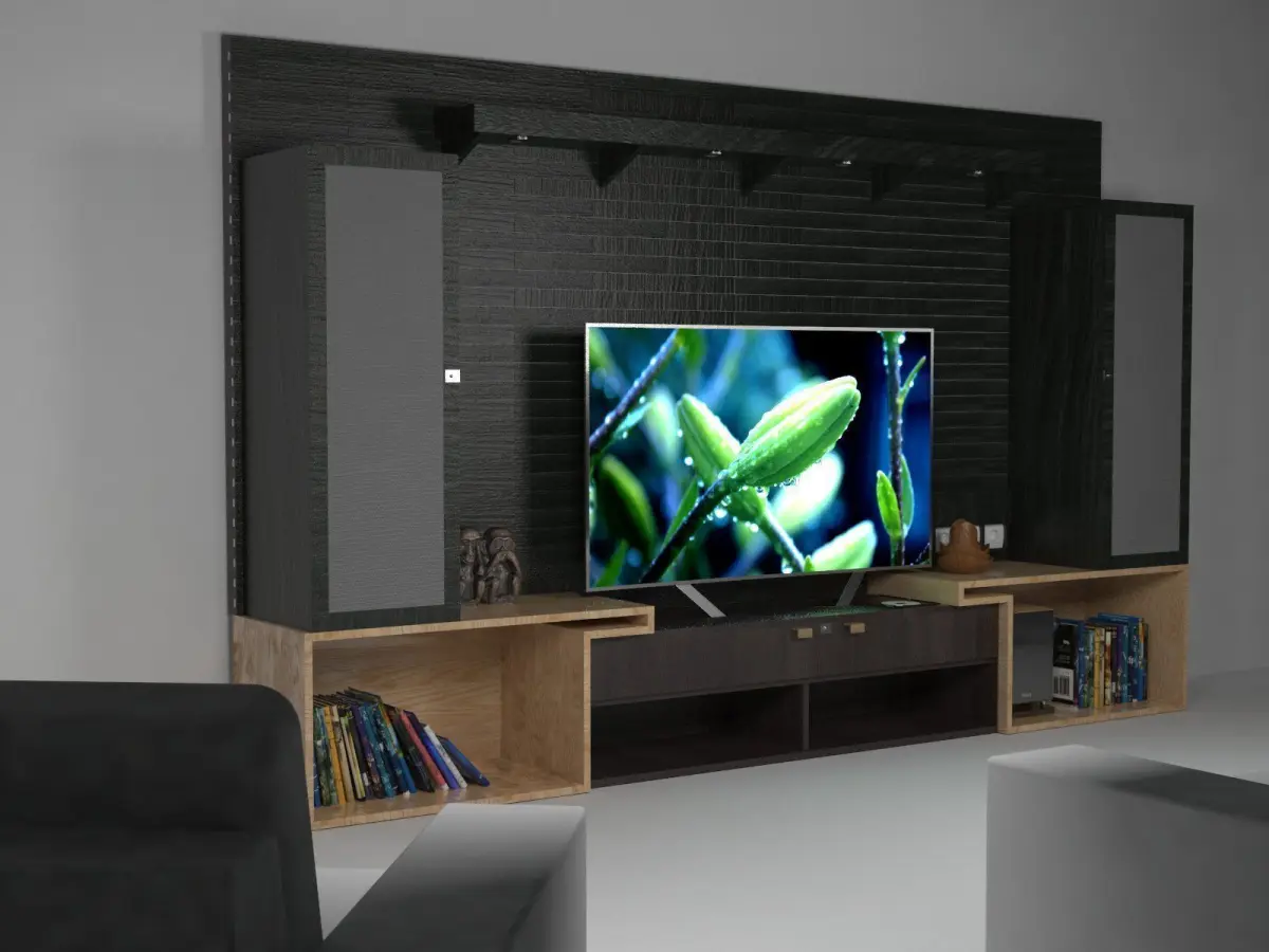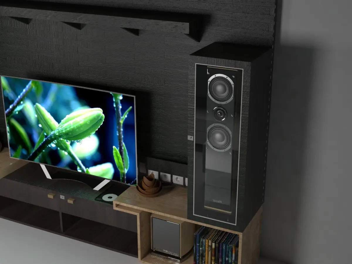 CUADRO is a complete furniture for a tv, with conection to a speaker, dvd reader, and space for books. Is designed to be in a living room for family enterteinment. All the assets have a great quality, and are ready to use.