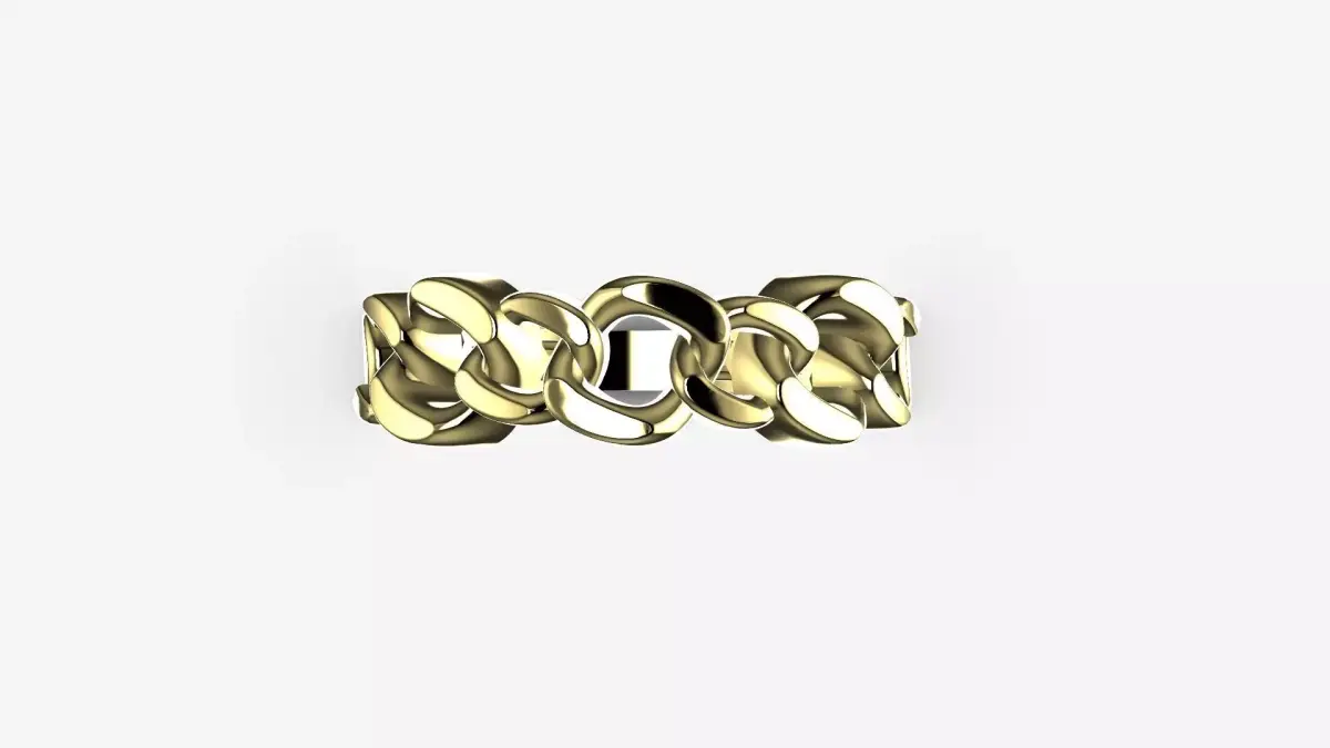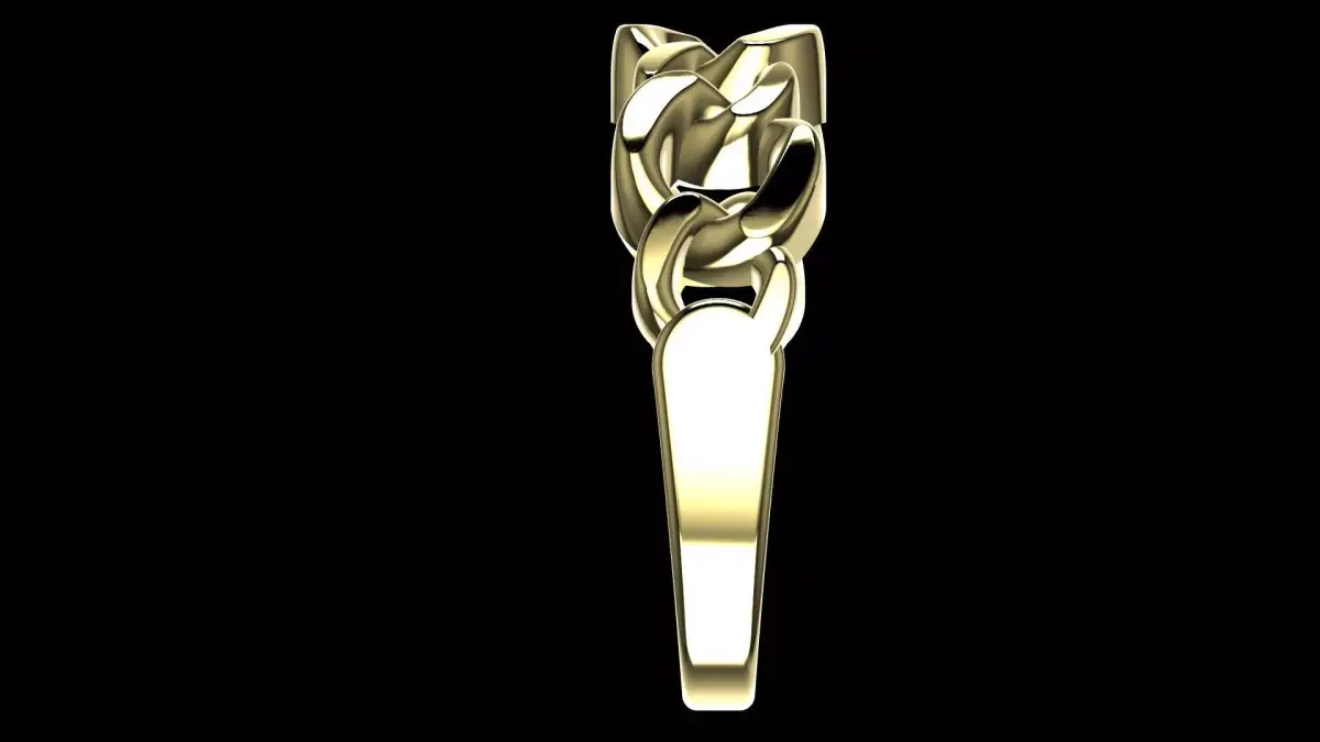 This design features a high-impact interlocking chain-link motif, reimagining the classic Cuban link into a structured ring silhouette. The top of the band is composed of thick, high-polish gold links that wrap around the finger with a dimensional, heavy-gauge appearance. The side profile reveals a sophisticated honeycomb under-gallery, which reduces metal weight for comfort while maintaining structural rigidity. The links transition seamlessly into a solid, smooth tapered shank at the base, ensuring a balanced fit.