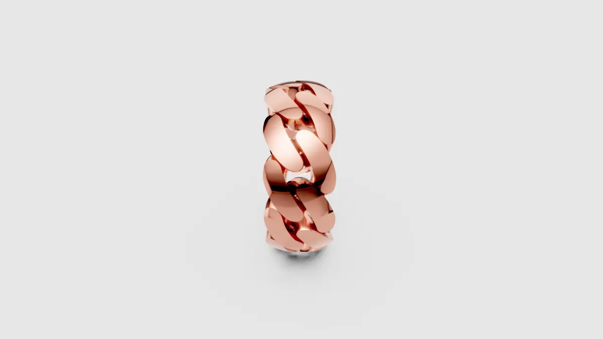 The overall design is a chunky, braided or Cuban-link style ring, typically used in fashion or statement jewelry.