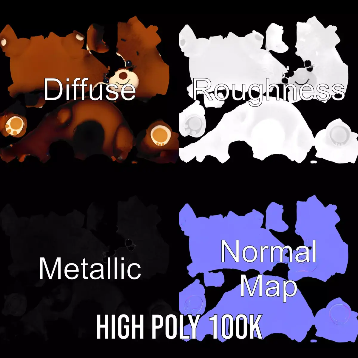 This 3D model pack features a charming and cuddly brown bear, perfect for creating warm and inviting scenes. Each model has 3 levels of detail: low-poly(1000 triangles for mobile), middle-poly(10,000 triangles for environment), and high-poly(100,000 triangles), which allows for the use of this model in production rendering (such as 3ds Max, Maya, Cinema 4D, Blender, Vray/Corona/Cycles and all other), game engines (Unity and Unreal compatible), and interactive presentations, providing a choice of detail based on the LOD System principle. Ideal for use in children's animations, games, and educational applications, the bear adds a joyful and playful element. The model's textures are PBR, Diffuse, NormalMap, and reflection/roughness/metallic, which are suitable for any modern rendering engine. All models accurately unwrapped and have no overlapping UVs. All textures are 4096*4096 in size. Please like and leave a comment for the model if you liked it.