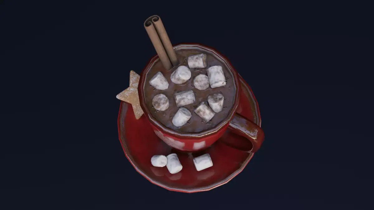 Inside each mug, the hot chocolate is topped with soft marshmallows dusted with cocoa, giving the impression of a rich drink that has just been stirred. A cinnamon stick rests inside as both a garnish and a subtle suggestion of scent. The saucer beneath each cup carries crumbs and small details, reinforcing the idea that this is something actually enjoyed, not just displayed. Scattered marshmallows and a star-shaped cookie complete the setting, adding small touches of realism and warmth.