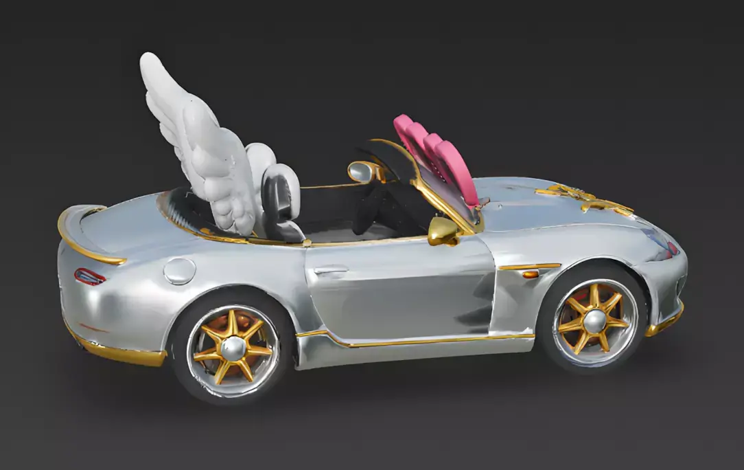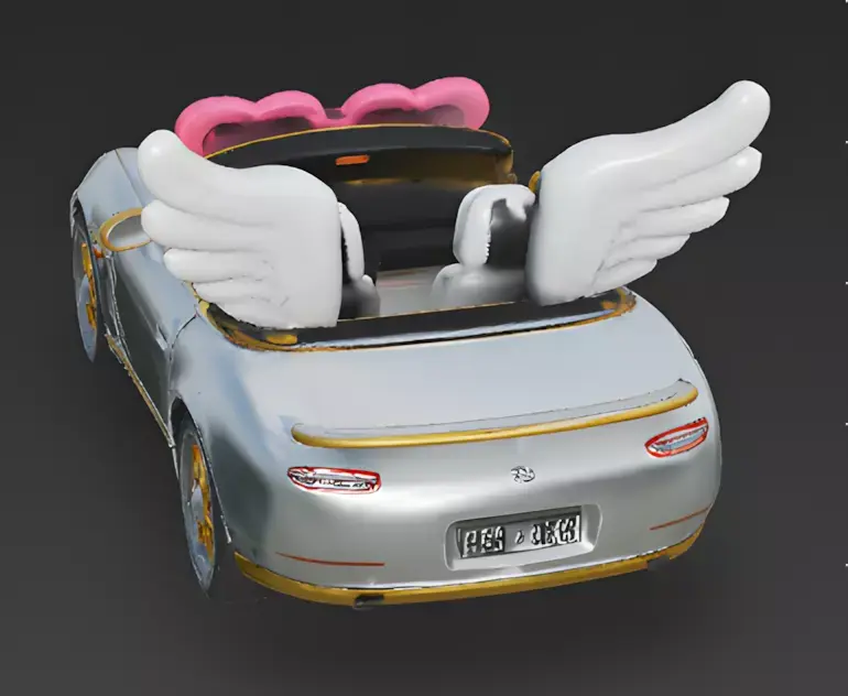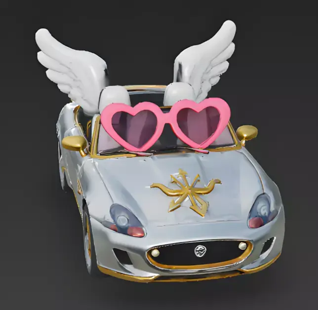 The Overall Concept The asset blends modern luxury automotive design with classical Cupid iconography. It is a sleek, white convertible roadster featuring angelic wings and archery-inspired accents, symbolizing love in the fast lane.