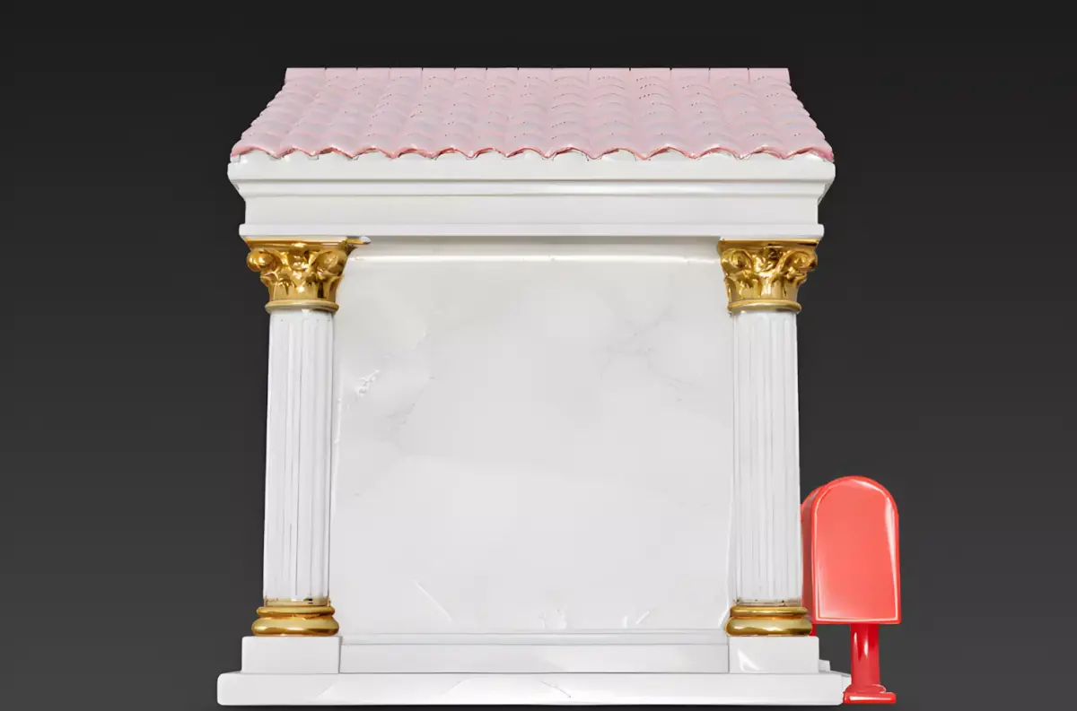 Golden Cupid & Corinthian ColumnsThe front of the building is decorated with a golden statue of Cupid with his bow, mounted right above the entrance. Two elegant Corinthian columns with polished gold capitals support the roof, reinforcing the divine and high-fantasy aesthetic of the structure.
