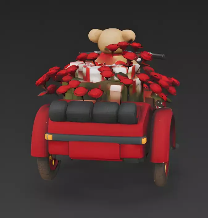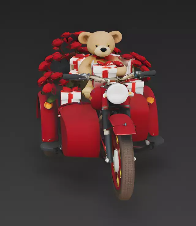 Files Included: FBX, GLB, OBJ, STL, ZIP (Textures). Quick Tip: The Roses and Gifts in the sidecar are separate mesh groups. You can remove them to use the bike as a regular vehicle or swap the cargo for other items like ammo or supplies.