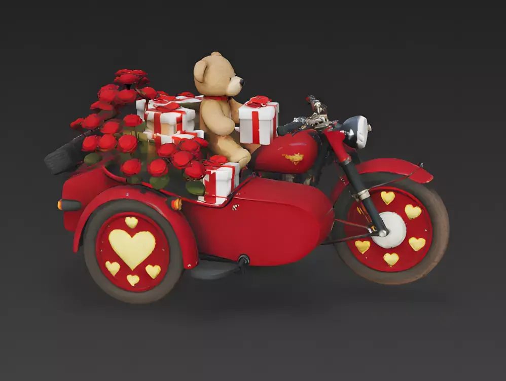 The Overall Concept This asset is the ultimate romantic delivery vehicle. It features a classic vintage motorcycle with a sidecar, repurposed from military use to deliver love and gifts, making it a charming addition to any holiday-themed game level.
