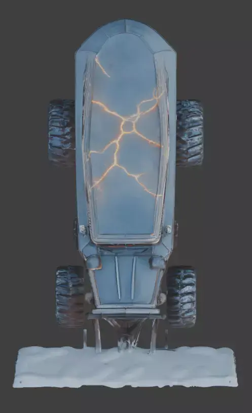 Meticulously crafted for game development and cinematic renders, the model includes advanced PBR textures that capture the contrast between frozen metallic surfaces and glowing, fiery cracks running through the armor plating. Key details include mud-and-snow-caked oversized all-terrain tires, a coffin-inspired rear body assembly, and a reinforced cabin built for high-speed wasteland navigation. This asset is an ideal choice for creators looking for a unique, high-impact vehicle for survival-horror, winter wasteland, or supernatural industrial scenes.