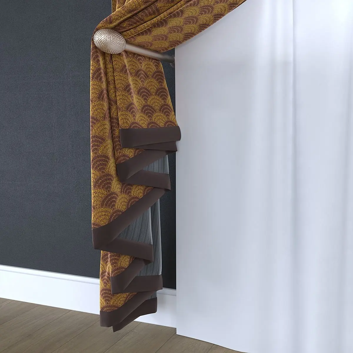 A modern curtain with a pickup, composition, tulle, cornice are present.Velvet material.