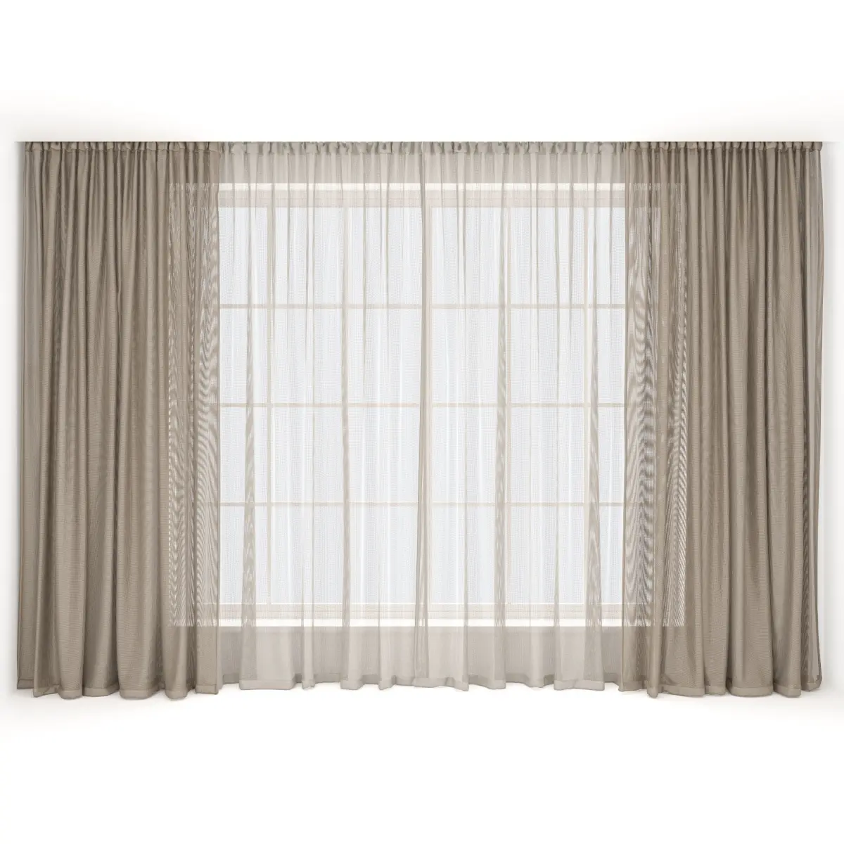 Mesh curtainsThe file contains curtains and a window. The window is made in a simplified manner.Overall size length 4200 mm, height 2900 mm.The size of the outer panel is 1050x2909 mm.The average blade is 2150x2900 mm.