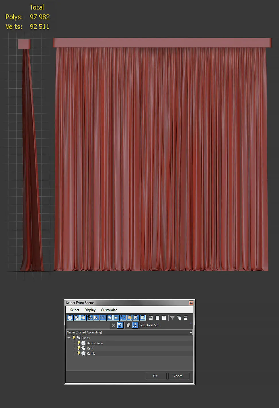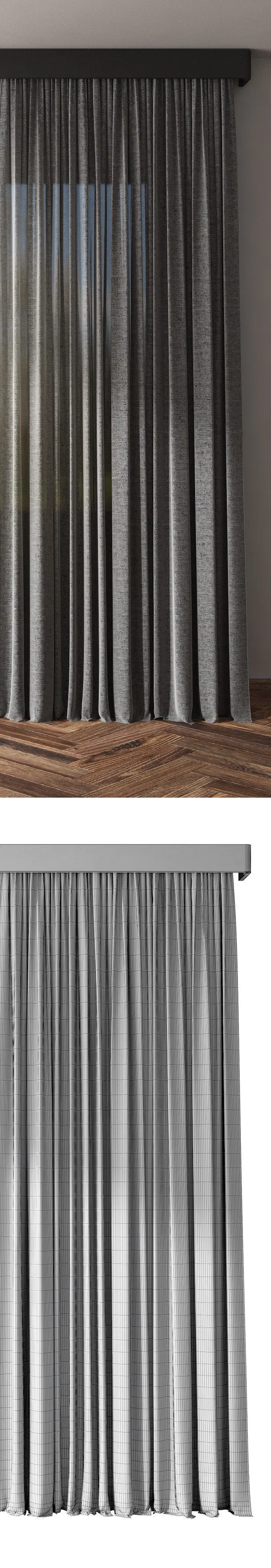 The model is grouped. Divided into 3 objects (curtains and tulle, edging and cornice)