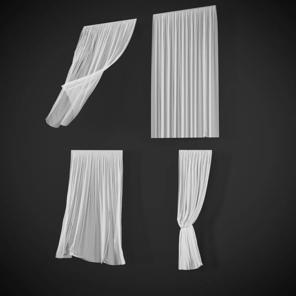 This product includes 4 options of wind curtain. All models have high accuracy and correct grid. Number of polygons: 467835Number of vertices: 235883 Number of polygons (average per element): 116000 Number of vertices (average per element): 58900
