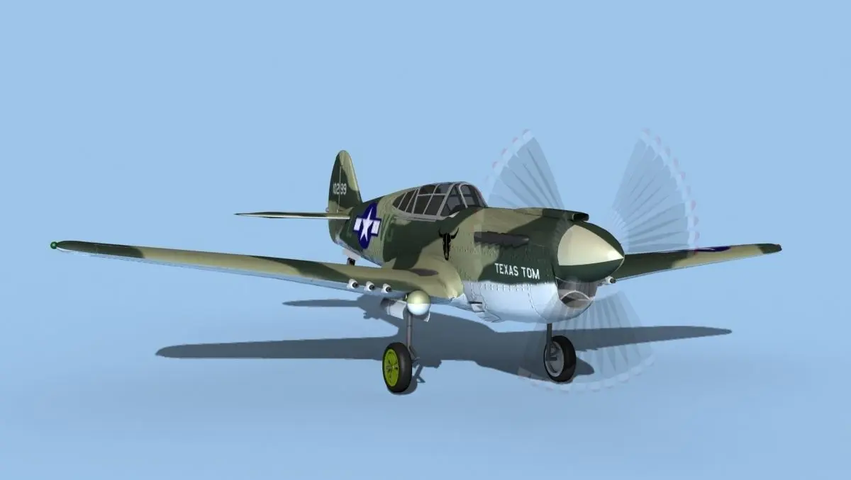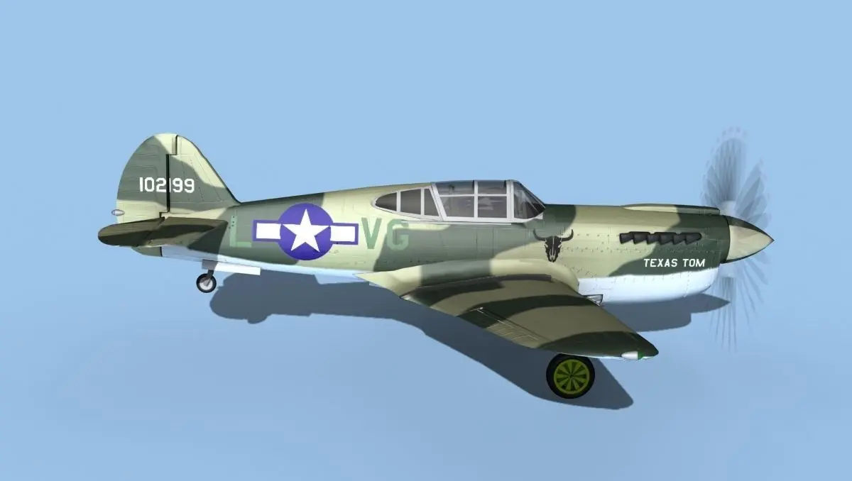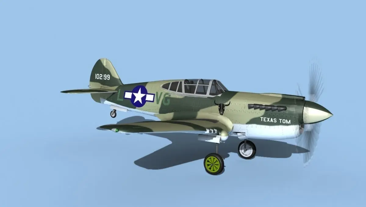 Curtiss P-40F is built near to scale and includes a lot of detail. The cockpit is well populated with seat, bullet proof shield, instruments, and controls as well as the exterior are complete with animateable flight controls. It also has an animated propeller, animateable landing gear and the canopy can slide open. The landing gear doors may be opened and closed. It is fully textured, and liveries are based on actual service liveries. There are 44 materials and textures used in this model. Many are as small as 200 x 200 pixels while others like wings are quite large at 2137x551 pixels. Textures are jpeg format in almost all cases. A Mtl file is included in the obj download.
